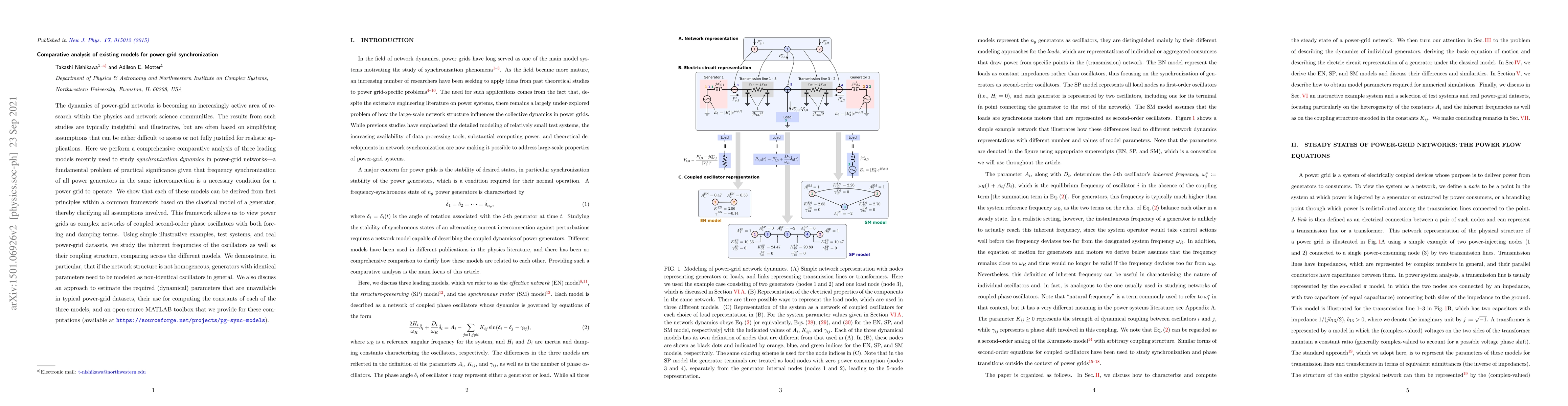 This paper conducts a comparative analysis of three prominent models for studying synchronization dynamics in power-grid networks, revealing that each model can be derived from a common framework of coupled second-order phase oscillators. The study highlights the importance of network structure heterogeneity and provides a MATLAB toolbox for estimating model parameters.