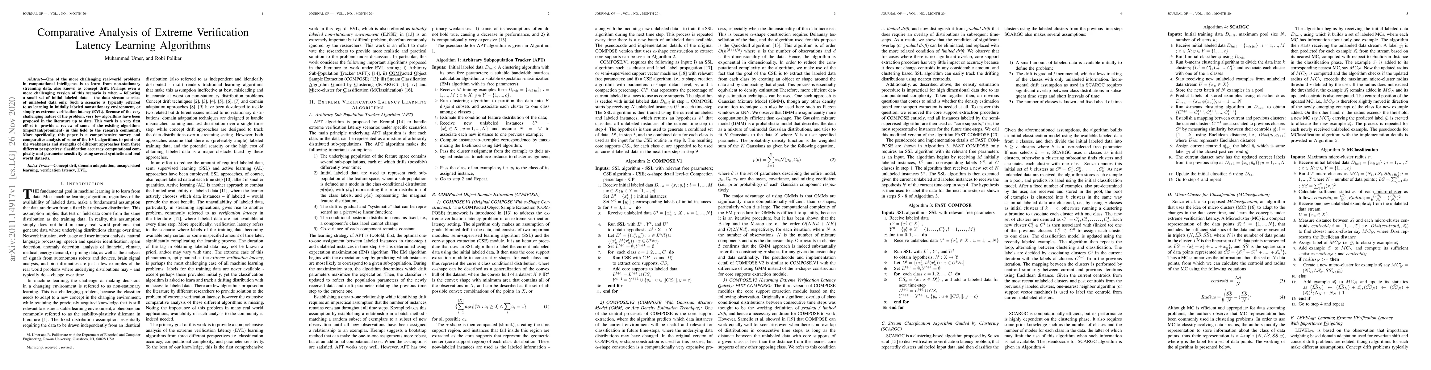 This paper conducts a comprehensive survey and comparative analysis of extreme verification latency (EVL) learning algorithms, focusing on their classification accuracy, computational complexity, and parameter sensitivity across various datasets. The study aims to highlight the strengths and weaknesses of existing EVL algorithms to guide future research.