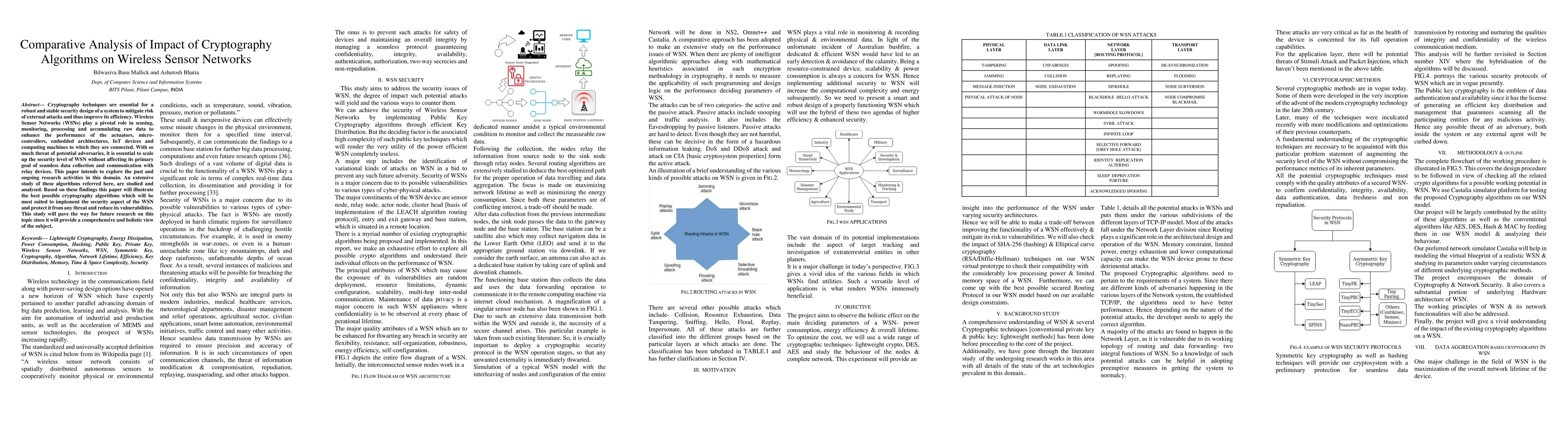 Cryptography techniques are essential for a robust and stable security design of a system to mitigate the risk of external attacks and thus improve its efficiency. Wireless Sensor Networks (WSNs) play a pivotal role in sensing, monitoring, processing, and accumulating raw data to enhance the performance of the actuators, micro-controllers, embedded architectures, IoT devices, and computing machines to which they are connected. With so much threat of potential adversaries, it is essential to scale up the security level of WSN without affecting its primary goal of seamless data collection and communication with relay devices. This paper intends to explore the past and ongoing research activities in this domain. An extensive study of these algorithms referred here, are studied and analyzed. Based on these findings this paper will illustrate the best possible cryptography algorithms which will be most suited to implement the security aspects of the WSN and protect it from any threat and reduce its vulnerabilities. This study will pave the way for future research on this topic since it will provide a comprehensive and holistic view of the subject.