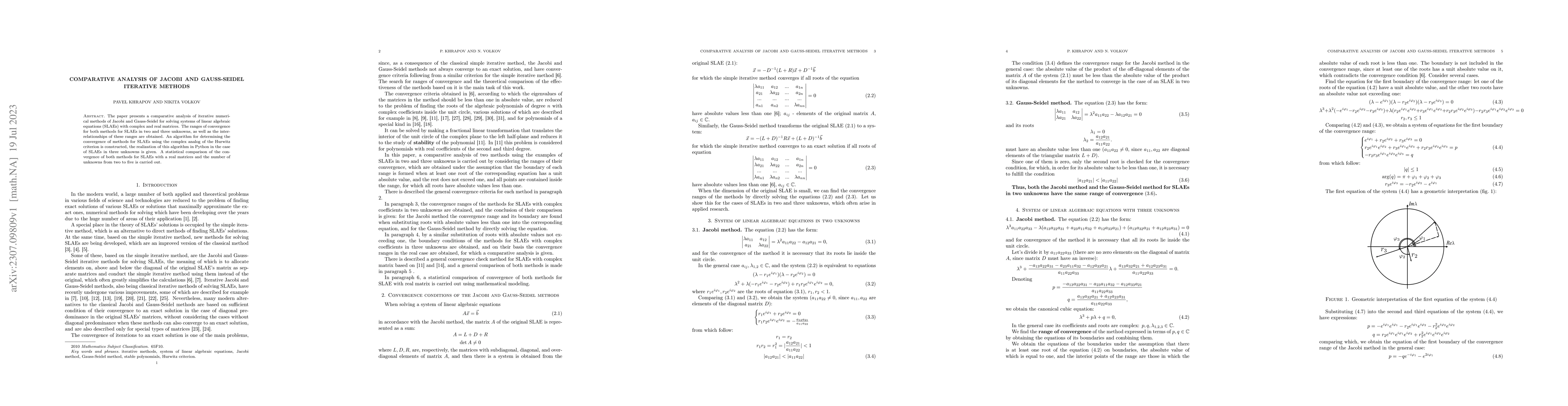The paper presents a comparative analysis of iterative numerical methods of Jacobi and Gauss-Seidel for solving systems of linear algebraic equations (SLAEs) with complex and real matrices. The ranges of convergence for both methods for SLAEs in two and three unknowns, as well as the interrelationships of these ranges are obtained. An algorithm for determining the convergence of methods for SLAEs using the complex analog of the Hurwitz criterion is constructed, the realization of this algorithm in Python in the case of SLAEs in three unknowns is given. A statistical comparison of the convergence of both methods for SLAEs with a real matrices and the number of unknowns from two to five is carried out.