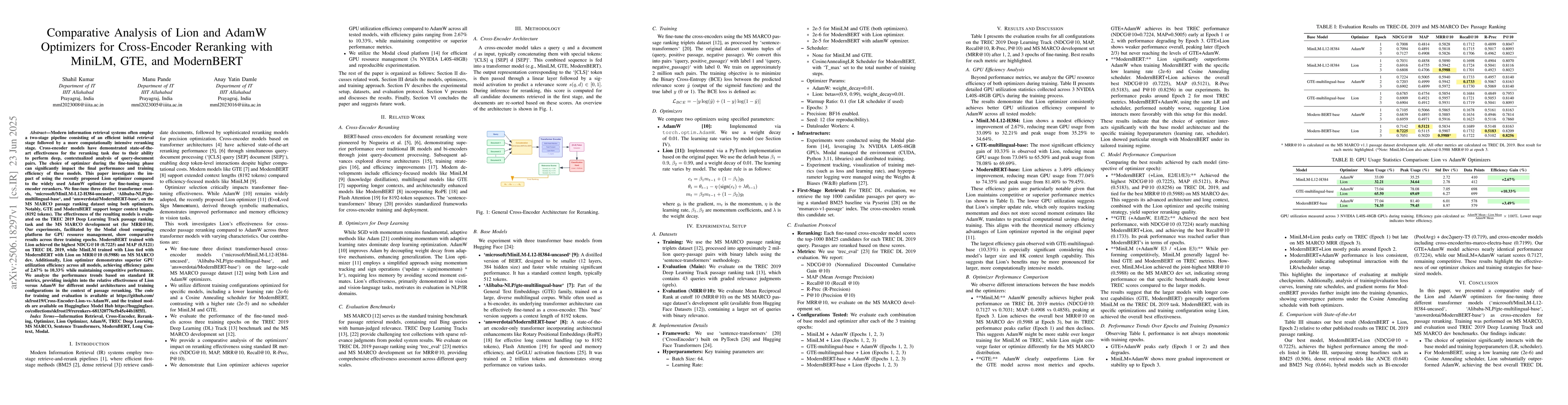 Modern information retrieval systems often employ a two-stage pipeline: an efficient initial retrieval stage followed by a computationally intensive reranking stage. Cross-encoders have shown strong effectiveness for reranking due to their deep analysis of query-document pairs. This paper studies the impact of the Lion optimizer, a recent alternative to AdamW, during fine-tuning of cross-encoder rerankers. We fine-tune three transformer models-MiniLM, GTE, and ModernBERT-on the MS MARCO passage ranking dataset using both optimizers. GTE and ModernBERT support extended context lengths (up to 8192 tokens). We evaluate effectiveness using TREC 2019 Deep Learning Track and MS MARCO dev set (MRR@10). Experiments, run on the Modal cloud platform, reveal that ModernBERT with Lion achieves the best NDCG@10 (0.7225) and MAP (0.5121) on TREC DL 2019, while MiniLM with Lion ties ModernBERT for MRR@10 (0.5988) on MS MARCO dev. Lion also provides superior GPU efficiency, improving utilization by 2.67% to 10.33% across models. We analyze performance trends using standard IR metrics and discuss the optimizer's impact on training dynamics across architectures.