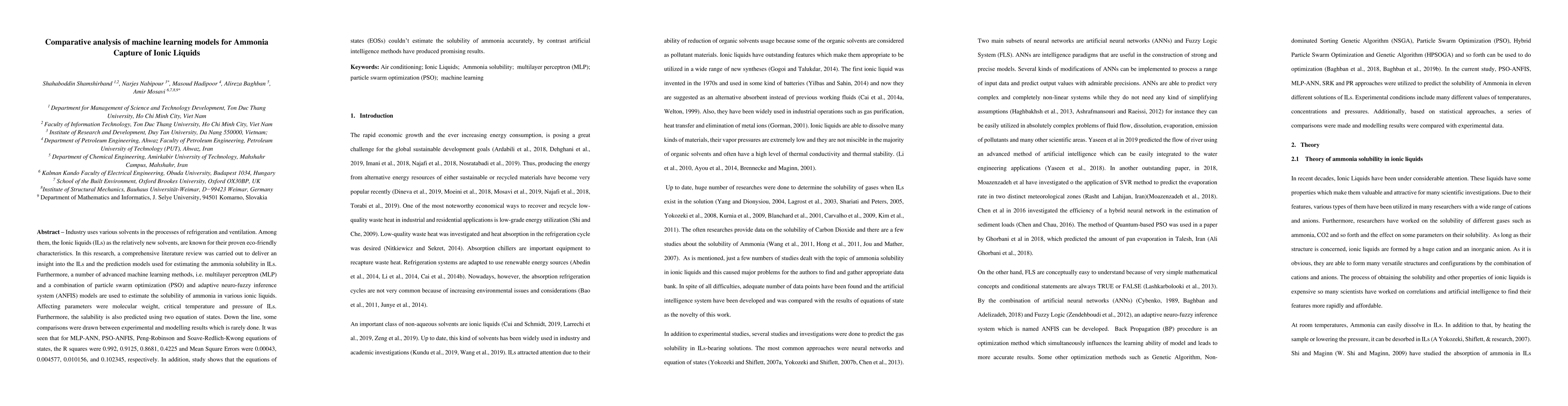 A comprehensive literature review was conducted, followed by the application of advanced machine learning methods, including multilayer perceptron (MLP) and a combination of particle swarm optimization (PSO) and adaptive neuro-fuzzy inference system (ANFIS), to estimate ammonia solubility in various ionic liquids (ILs). The affecting parameters were molecular weight, critical temperature, and pressure of ILs, with salability predicted using two-equation of states.