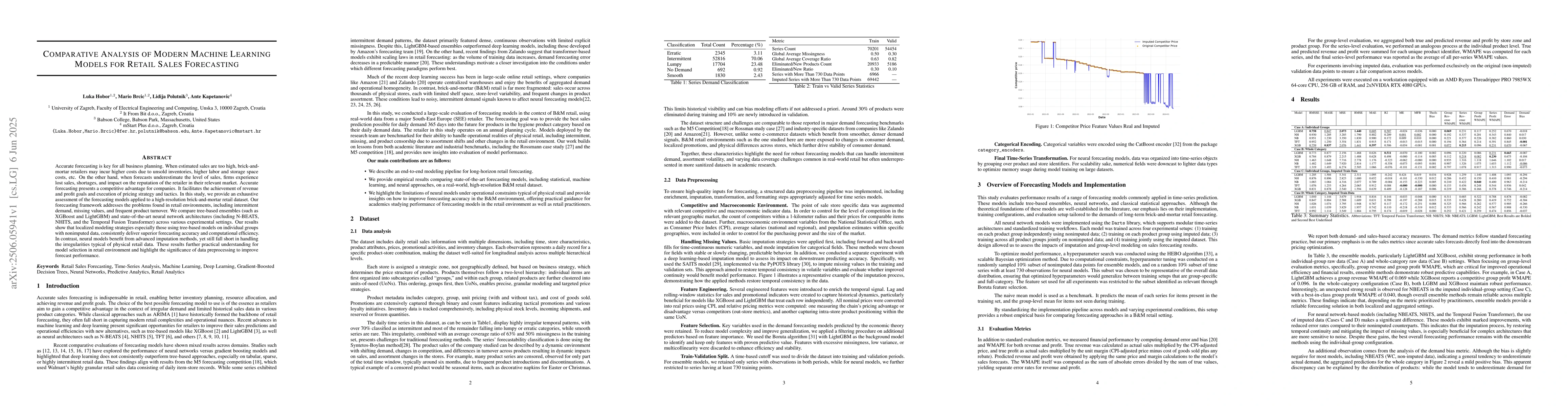 The paper presents a comprehensive comparative analysis of machine learning models for retail sales forecasting, identifying the strengths and weaknesses of tree-based ensembles and neural networks in handling retail data irregularities.