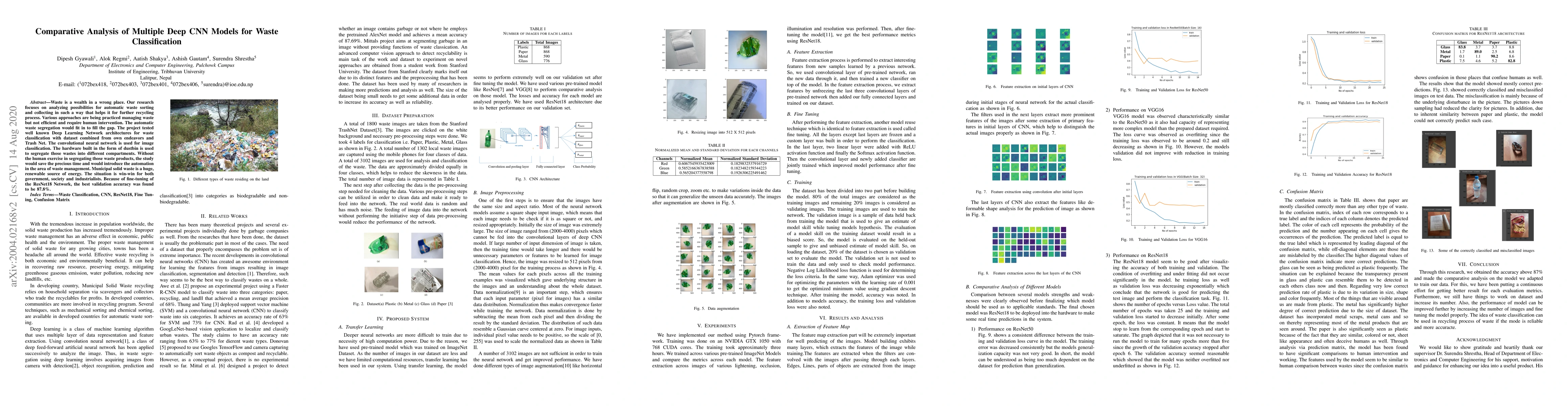 This research compares various deep convolutional neural network models for automatic waste classification to facilitate recycling, achieving 87.8% accuracy with fine-tuned ResNet18. The study aims to automate waste sorting, reducing reliance on human intervention and enhancing waste management efficiency.