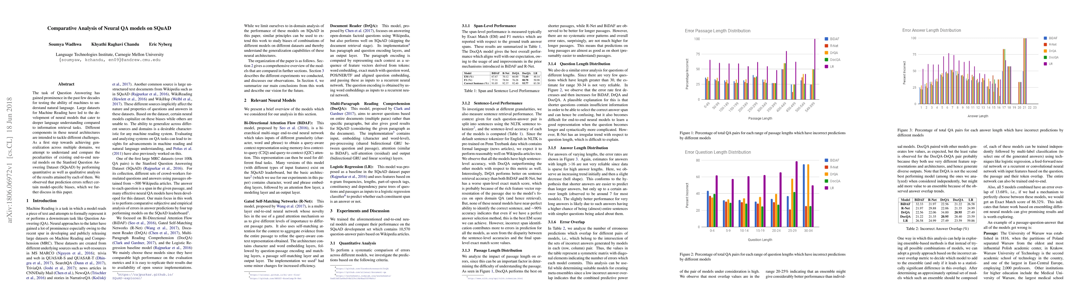 The task of Question Answering has gained prominence in the past few decades for testing the ability of machines to understand natural language. Large datasets for Machine Reading have led to the development of neural models that cater to deeper language understanding compared to information retrieval tasks. Different components in these neural architectures are intended to tackle different challenges. As a first step towards achieving generalization across multiple domains, we attempt to understand and compare the peculiarities of existing end-to-end neural models on the Stanford Question Answering Dataset (SQuAD) by performing quantitative as well as qualitative analysis of the results attained by each of them. We observed that prediction errors reflect certain model-specific biases, which we further discuss in this paper.