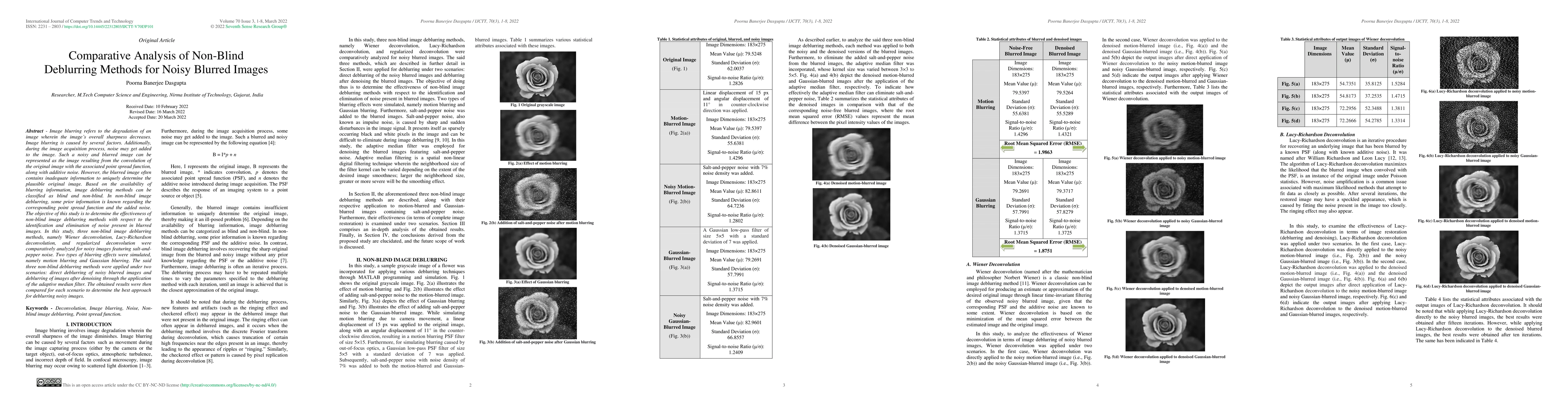 This study compares the effectiveness of non-blind deblurring methods—Wiener deconvolution, Lucy-Richardson deconvolution, and regularized deconvolution—for noisy blurred images. The methods were evaluated under two scenarios: direct deblurring and deblurring after initial denoising, for both motion and Gaussian blurring.