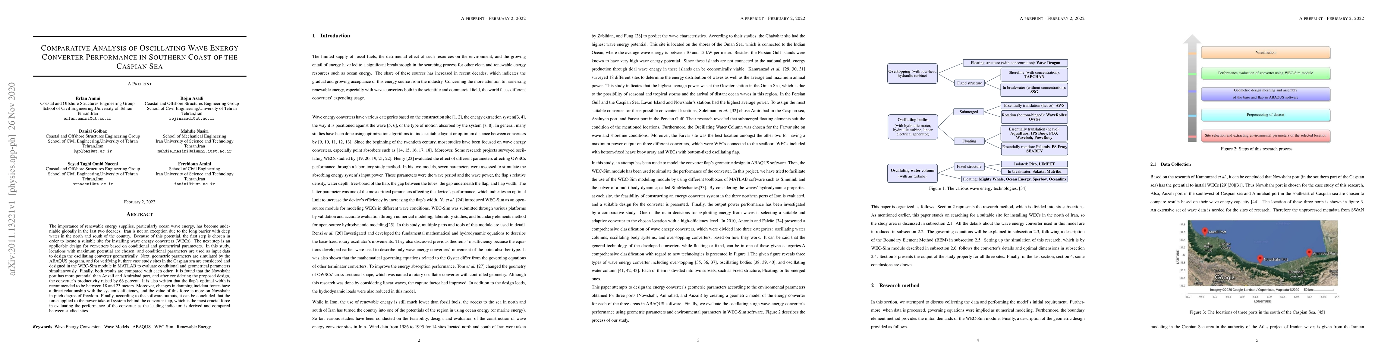 This study evaluates the performance of oscillating wave energy converters in three locations on the southern coast of the Caspian Sea, finding Nowshahr port to have the most potential. The proposed design increased converter productivity by 63 percent, with optimal flap widths between 18 and 23 meters, and highlighted the importance of damping incident forces for system efficiency.
