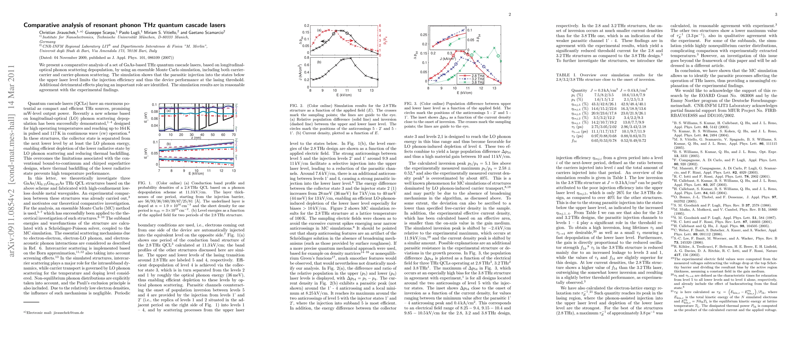 This paper uses Monte Carlo simulations to compare GaAs-based THz quantum cascade lasers, identifying that parasitic injection into lower states limits efficiency and performance. The simulation results align well with experimental data, highlighting additional detrimental effects.