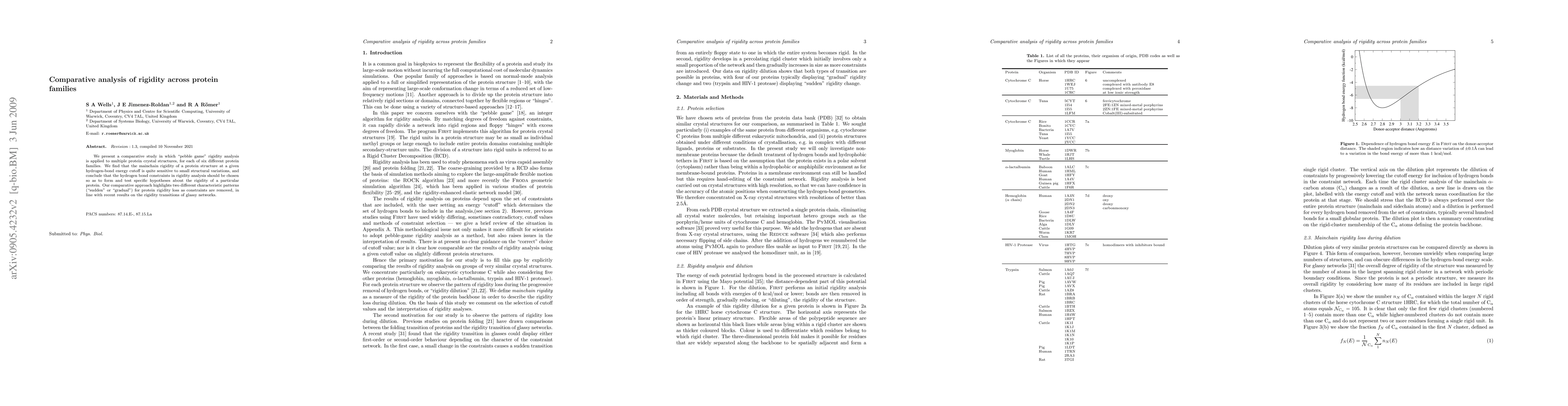 Rigidity analysis using the "pebble game" has been applied to protein crystal structures to obtain information on protein folding, assembly and t he structure-function relationship. However, previous work using this technique has not made clear how the set of hydrogen-bond constraints included in the rigidity analysis should be chosen, nor how sensitive the results of rigidity analysis are to small structural variations. We present a comparative study in which "pebble game" rigidity analysis is applied to multiple protein crystal structures, for each of six differen t protein families. We find that the mainchain rigidity of a protein structure at a given hydrogen-bond energy cutoff is quite sensitive to small structural variations, and conclude that the hydrogen bond constraints in rigidity analysis should be chosen so as to form and test specific hypotheses about the rigidity o f a particular protein. Our comparative approach highlights two different characteristic patterns ("sudden" or "gradual") for protein rigidity loss as constraints are re moved, in line with recent results on the rigidity transitions of glassy networks.