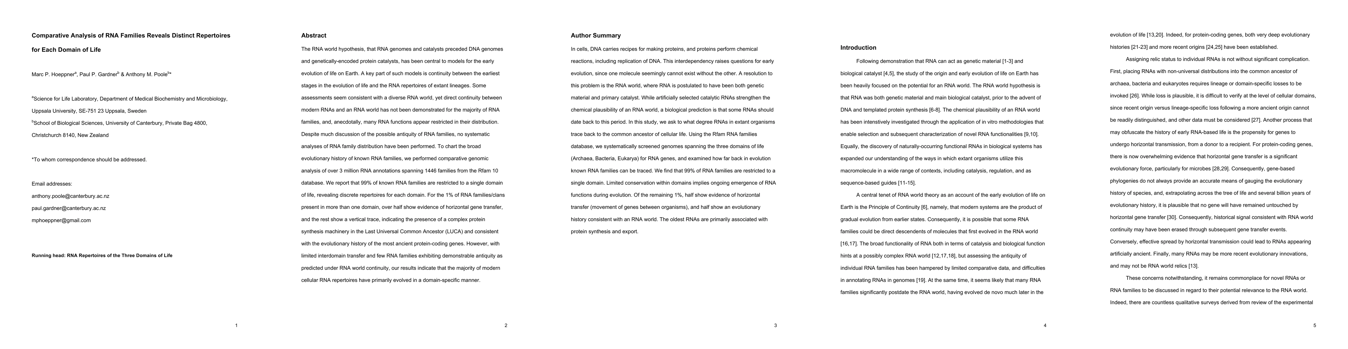 This paper conducts a comprehensive comparative genomic analysis of RNA families across domains of life, revealing that 99% of RNA families are domain-specific, suggesting limited interdomain RNA transfer and a predominantly domain-specific evolution of modern RNA repertoires. The study highlights the complexity of protein synthesis machinery in the Last Universal Common Ancestor (LUCA) and challenges the notion of direct continuity between modern RNAs and an RNA world.