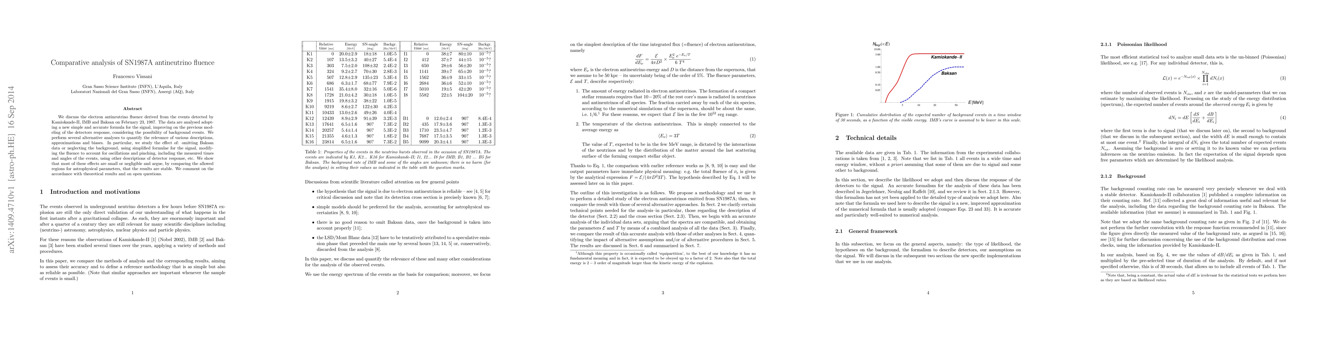 We discuss the electron antineutrino fluence derived from the events detected by Kamiokande-II, IMB and Baksan on February 23, 1987. The data are analysed adopting a new simple and accurate formula for the signal, improving on the previous modeling of the detectors response, considering the possibility of background events. We perform several alternative analyses to quantify the relevance of various descriptions, approximations and biases. In particular, we study the effect of: omitting Baksan data or neglecting the background, using simplified formulae for the signal, modifying the fluence to account for oscillations and pinching, including the measured times and angles of the events, using other descriptions of detector response, etc. We show that most of these effects are small or negligible and argue, by comparing the allowed regions for astrophysical parameters, that the results are stable. We comment on the accordance with theoretical results and on open questions.