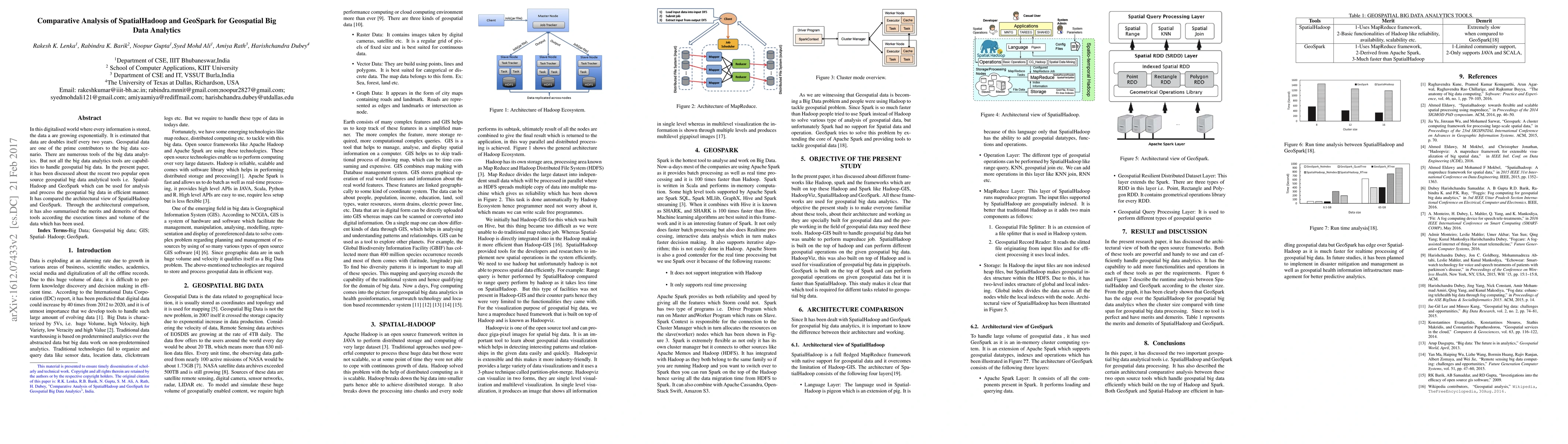 In this digitalised world where every information is stored, the data a are growing exponentially. It is estimated that data are doubles itself every two years. Geospatial data are one of the prime contributors to the big data scenario. There are numerous tools of the big data analytics. But not all the big data analytics tools are capabilities to handle geospatial big data. In the present paper, it has been discussed about the recent two popular open source geospatial big data analytical tools i.e. Spatial- Hadoop and GeoSpark which can be used for analysis and process the geospatial big data in efficient manner. It has compared the architectural view of SpatialHadoop and GeoSpark. Through the architectural comparison, it has also summarised the merits and demerits of these tools according the execution times and volume of the data which has been used.