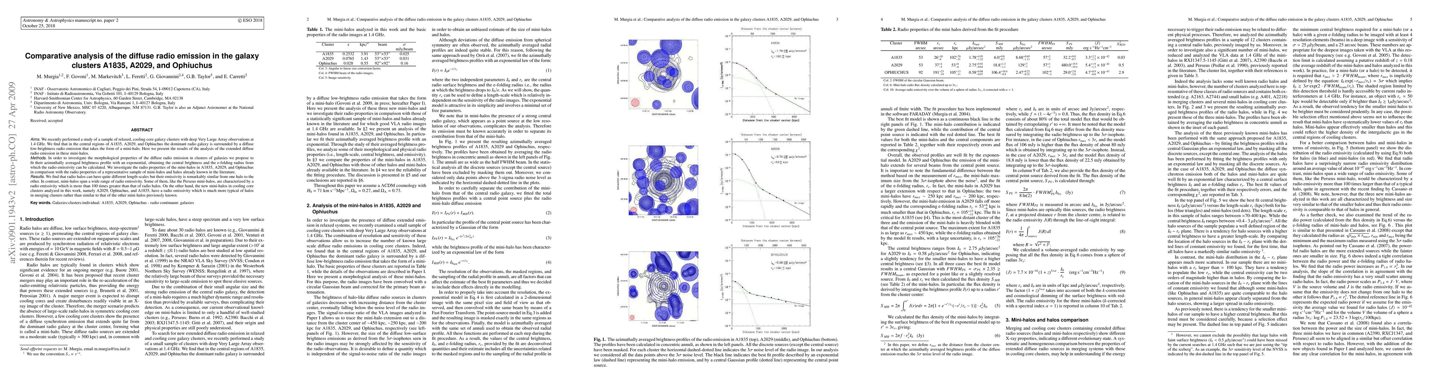 We recently performed a study of a sample of relaxed, cooling core galaxy clusters with deep Very Large Array observations at 1.4 GHz. We find that in the central regions of A1835, A2029, and Ophiuchus the dominant radio galaxy is surrounded by a diffuse low-brightness radio emission that takes the form of a mini-halo. Here we present the results of the analysis of the extended diffuse radio emission in these mini-halos. In order to investigate the morphological properties of the diffuse radio emission in clusters of galaxies we propose to fit their azimuthally averaged brightness profile with an exponential, obtaining the central brightness and the e-folding radius from which the radio emissivity can be calculated. We investigate the radio properties of the mini-halos in A1835, A2029, and Ophiuchus in comparison with the radio properties of a representative sample of mini-halos and halos already known in the literature. We find that radio halos can have quite different length-scales but their emissivity is remarkably similar from one halo to the other. In contrast, mini-halos span a wide range of radio emissivity. Some of them, like the Perseus mini-halos, are characterized by a radio emissivity which is more than 100 times greater than that of radio halos. On the other hand, the new mini-halos in cooling core clusters analyzed in this work, namely A2029, Ophiuchus, and A1835, have a radio emissivity which is much more typical of halos in merging clusters rather than similar to that of the other mini-halos previously known.