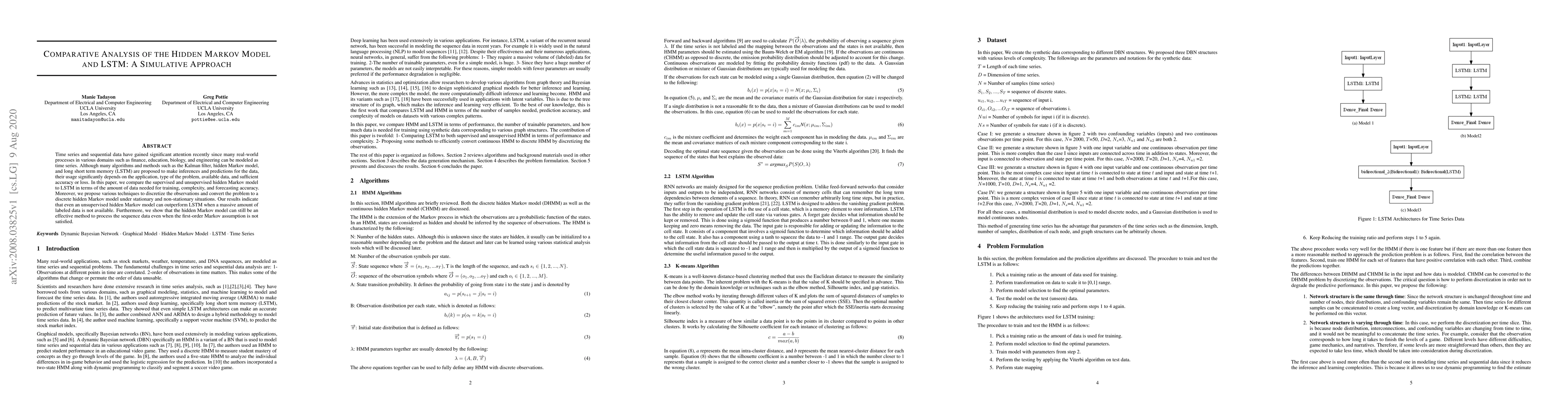 Time series and sequential data have gained significant attention recently since many real-world processes in various domains such as finance, education, biology, and engineering can be modeled as time series. Although many algorithms and methods such as the Kalman filter, hidden Markov model, and long short term memory (LSTM) are proposed to make inferences and predictions for the data, their usage significantly depends on the application, type of the problem, available data, and sufficient accuracy or loss. In this paper, we compare the supervised and unsupervised hidden Markov model to LSTM in terms of the amount of data needed for training, complexity, and forecasting accuracy. Moreover, we propose various techniques to discretize the observations and convert the problem to a discrete hidden Markov model under stationary and non-stationary situations. Our results indicate that even an unsupervised hidden Markov model can outperform LSTM when a massive amount of labeled data is not available. Furthermore, we show that the hidden Markov model can still be an effective method to process the sequence data even when the first-order Markov assumption is not satisfied.
