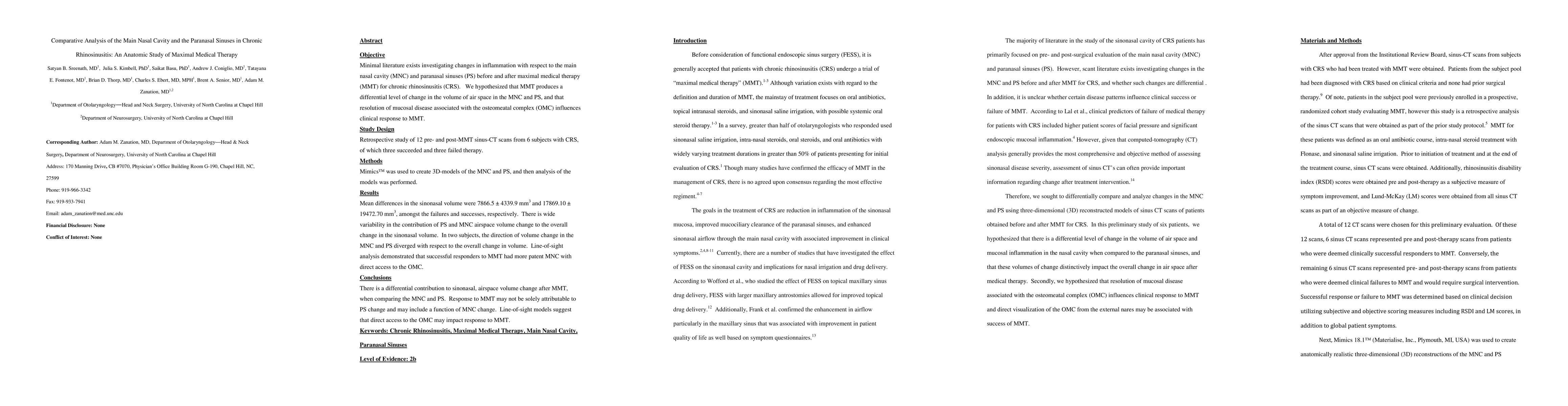 A study analyzed changes in nasal cavity and paranasal sinus volumes before and after maximal medical therapy for chronic rhinosinusitis, finding differential changes between the two areas that may influence treatment response.