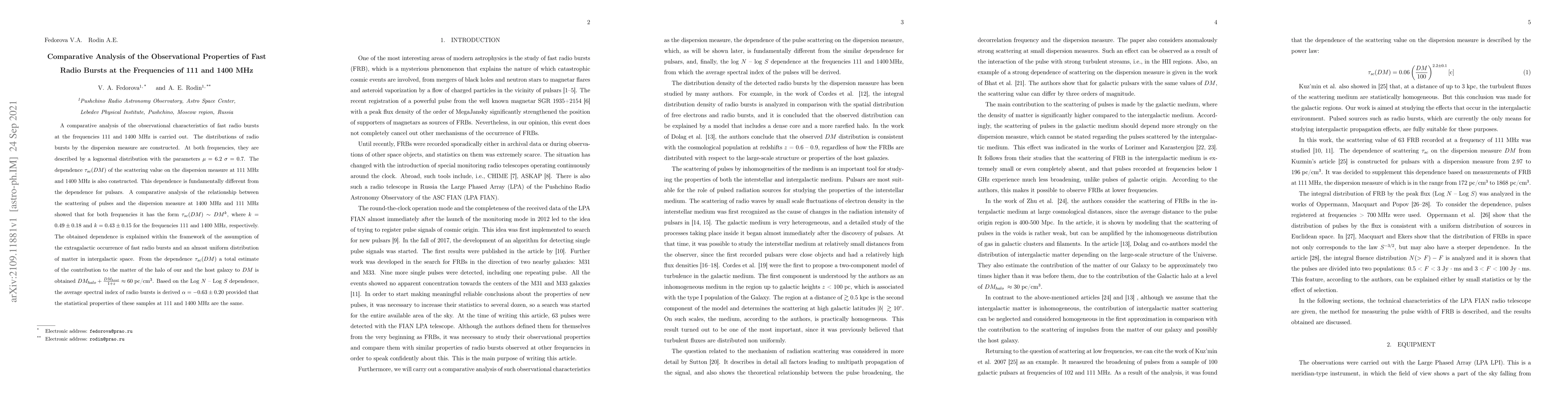 A comparative analysis of the observational characteristics of fast radio bursts at the frequencies 111 and 1400 MHz is carried out. The distributions of radio bursts by the dispersion measure are constructed. At both frequencies, they are described by a lognormal distribution with the parameters $\mu =6.2$ $\sigma = 0.7$. The dependence $\tau_{sc}(DM)$ of the scattering value on the dispersion measure at 111 MHz and 1400 MHz is also constructed. This dependence is fundamentally different from the dependence for pulsars. A comparative analysis of the relationship between the scattering of pulses and the dispersion measure at 1400 MHz and 111 MHz showed that for both frequencies it has the form $\tau_{sc}(DM)\sim DM^k$, where $k = 0.49 \pm 0.18$ and $k = 0.43 \pm 0.15$ for the frequencies 111 and 1400 MHz, respectively. The obtained dependence is explained within the framework of the assumption of the extragalactic occurrence of fast radio bursts and an almost uniform distribution of matter in intergalactic space. From the dependence $\tau_{sc}(DM)$ a total estimate of the contribution to the matter of the halo of our and the host galaxy to $DM$ is obtained $DM_{halo} + \frac{DM_{host}}{1+z}\approx 60\;{\rm pc/cm}^3$. Based on the LogN - LogS dependence, the average spectral index of radio bursts is derived $\alpha = - 0.63 \pm 0.20$ provided that the statistical properties of these samples at 111 and 1400 MHz are the same.
