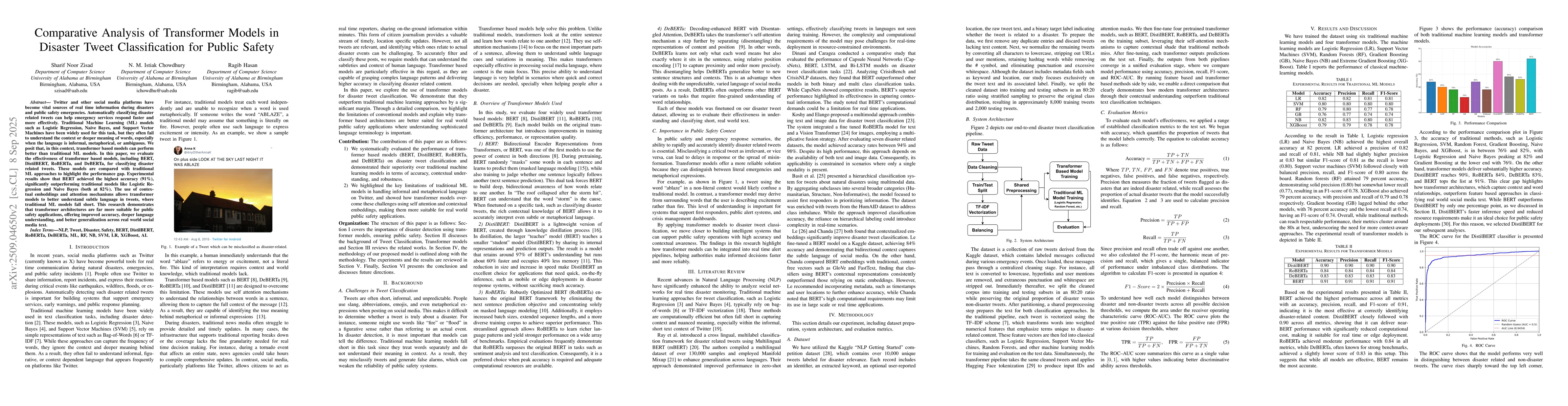Twitter and other social media platforms have become vital sources of real time information during disasters and public safety emergencies. Automatically classifying disaster related tweets can help emergency services respond faster and more effectively. Traditional Machine Learning (ML) models such as Logistic Regression, Naive Bayes, and Support Vector Machines have been widely used for this task, but they often fail to understand the context or deeper meaning of words, especially when the language is informal, metaphorical, or ambiguous. We posit that, in this context, transformer based models can perform better than traditional ML models. In this paper, we evaluate the effectiveness of transformer based models, including BERT, DistilBERT, RoBERTa, and DeBERTa, for classifying disaster related tweets. These models are compared with traditional ML approaches to highlight the performance gap. Experimental results show that BERT achieved the highest accuracy (91%), significantly outperforming traditional models like Logistic Regression and Naive Bayes (both at 82%). The use of contextual embeddings and attention mechanisms allows transformer models to better understand subtle language in tweets, where traditional ML models fall short. This research demonstrates that transformer architectures are far more suitable for public safety applications, offering improved accuracy, deeper language understanding, and better generalization across real world social media text.