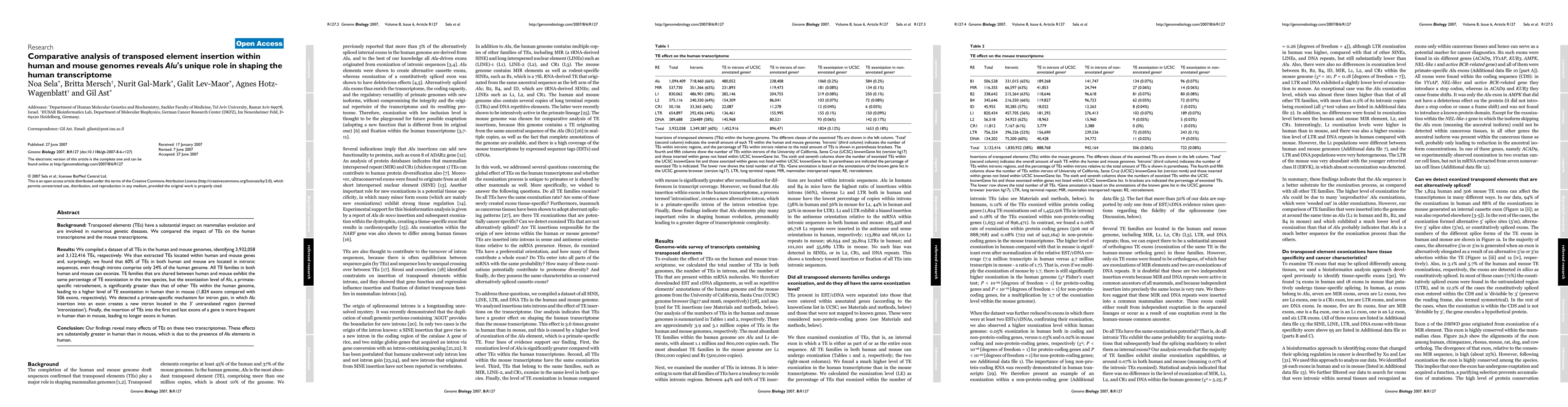 This study compares the impact of transposed elements on human and mouse genomes, revealing that Alu elements significantly contribute to shaping the human transcriptome through unique mechanisms such as intron gain.