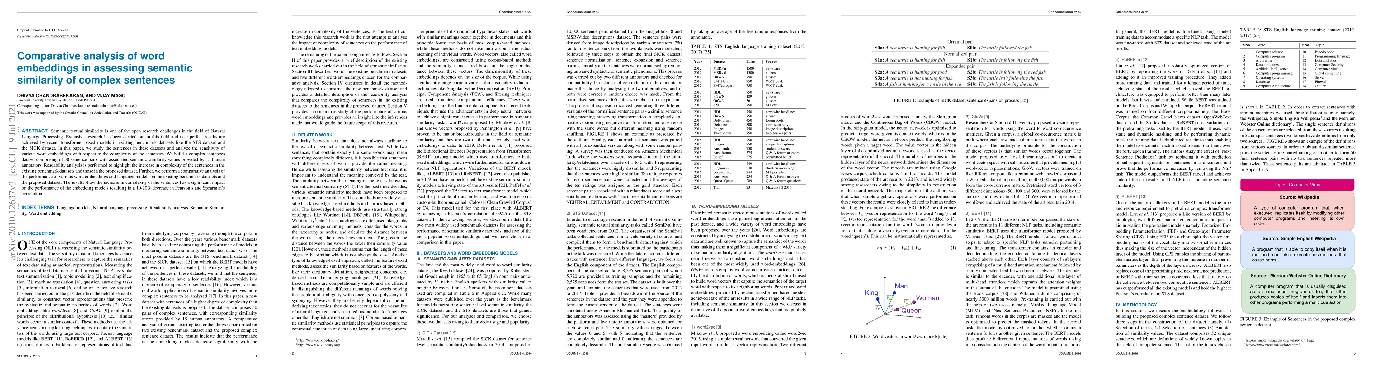 Semantic textual similarity is one of the open research challenges in the field of Natural Language Processing. Extensive research has been carried out in this field and near-perfect results are achieved by recent transformer-based models in existing benchmark datasets like the STS dataset and the SICK dataset. In this paper, we study the sentences in these datasets and analyze the sensitivity of various word embeddings with respect to the complexity of the sentences. We build a complex sentences dataset comprising of 50 sentence pairs with associated semantic similarity values provided by 15 human annotators. Readability analysis is performed to highlight the increase in complexity of the sentences in the existing benchmark datasets and those in the proposed dataset. Further, we perform a comparative analysis of the performance of various word embeddings and language models on the existing benchmark datasets and the proposed dataset. The results show the increase in complexity of the sentences has a significant impact on the performance of the embedding models resulting in a 10-20% decrease in Pearson's and Spearman's correlation.