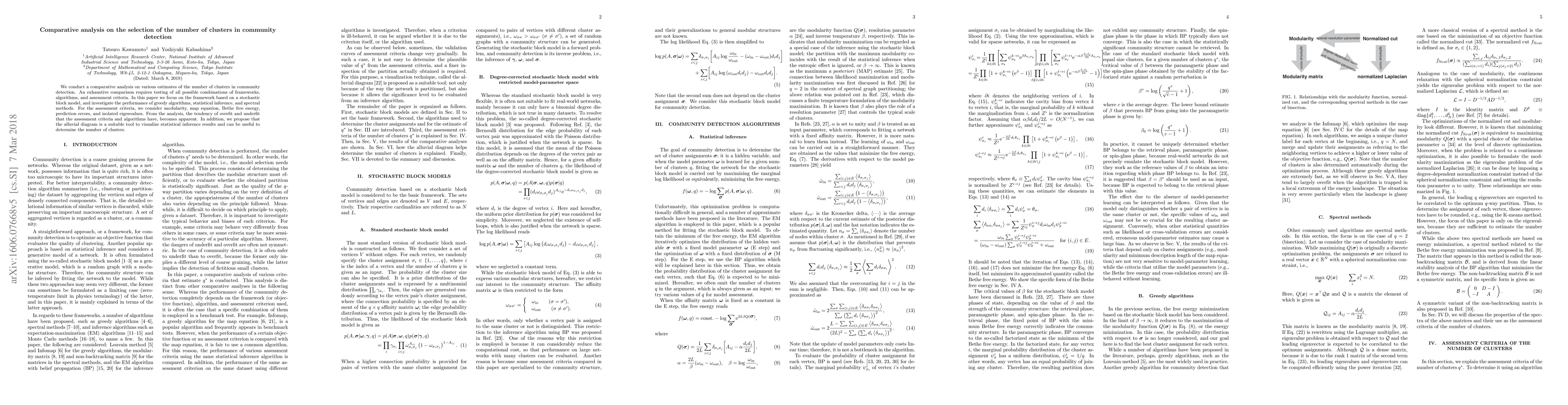 We conduct a comparative analysis on various estimates of the number of clusters in community detection. An exhaustive comparison requires testing of all possible combinations of frameworks, algorithms, and assessment criteria. In this paper we focus on the framework based on a stochastic block model, and investigate the performance of greedy algorithms, statistical inference, and spectral methods. For the assessment criteria, we consider modularity, map equation, Bethe free energy, prediction errors, and isolated eigenvalues. From the analysis, the tendency of overfit and underfit that the assessment criteria and algorithms have, becomes apparent. In addition, we propose that the alluvial diagram is a suitable tool to visualize statistical inference results and can be useful to determine the number of clusters.
