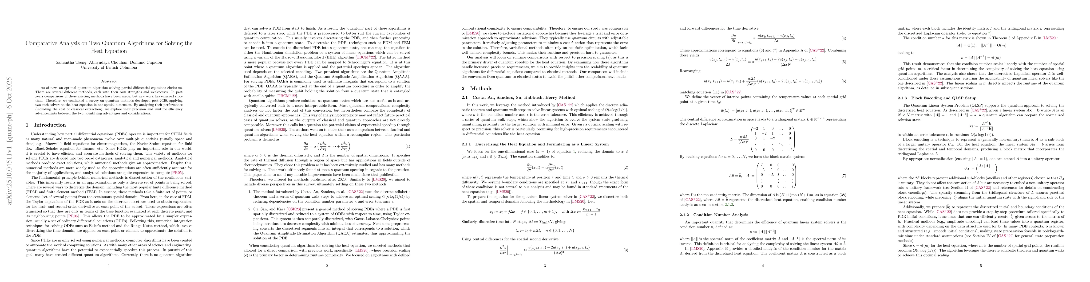 The paper compares two quantum algorithms for solving the heat equation: one based on quantum linear system solving (QLSP) with adiabatic evolution and block encoding, and another using Chebyshev points combined with quantum amplitude estimation algorithm (QAEA). Both methods are evaluated under the LMS benchmark for fair classical-quantum comparison.