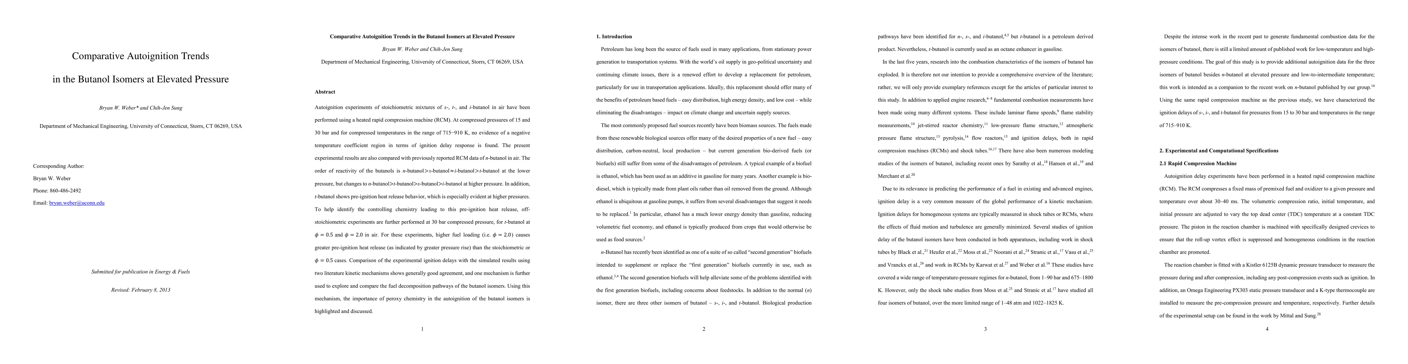 This study investigates the autoignition behavior of butanol isomers (s-, t-, and i-butanol) under elevated pressures using a rapid compression machine, revealing that reactivity order changes with pressure, and t-butanol exhibits pre-ignition heat release, which is more pronounced at higher fuel loadings. Kinetic modeling supports the findings and emphasizes the role of peroxy chemistry in the autoignition process.