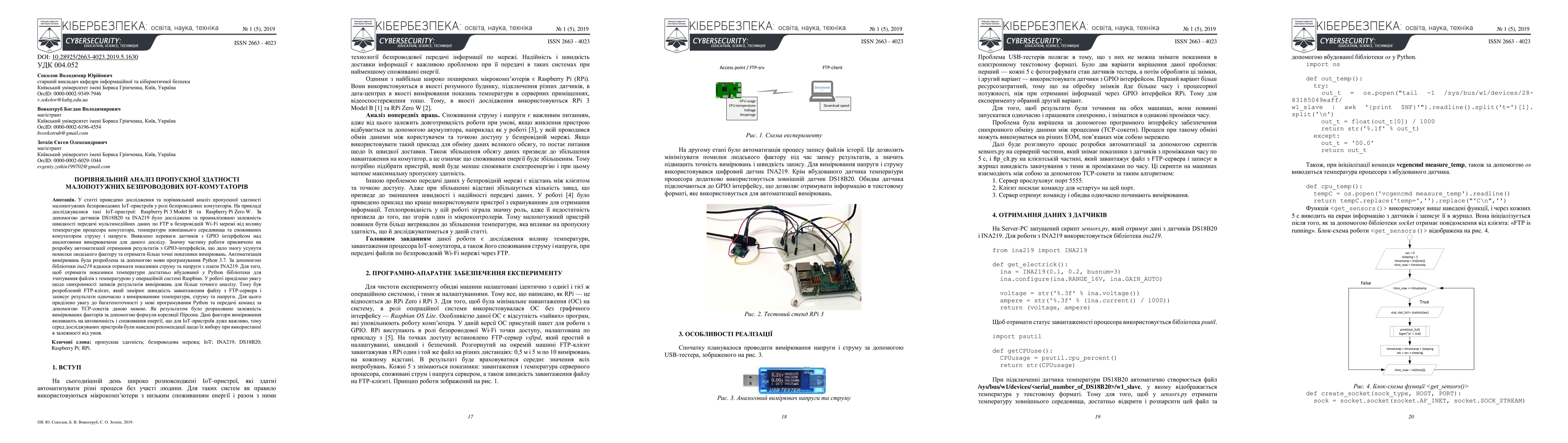 The article presents the research and comparative analysis of the bandwidth of low-power wireless IoT devices as wireless switches. The following IoT devices were investigated: Raspberry Pi 3 Model B and Raspberry Pi Zero W. The DS18B20 and INA219 sensors investigated and analyzed the dependence of FTP multimedia data transmission speed on wireless Wi-Fi network on the temperature of the switch processor, temperature. The environment and the current and voltage consumed by the switch. Advantages of sensors with GPIO interface over analog meters for this experiment are revealed. Much of the work is devoted to the development of automation of results from GPIO interfaces, which helped eliminate human error and get more accurate metrics. Measurement automation was developed using Python 3.7 programming language. Using the INA219 library we were able to obtain current and voltage indicators from the ina219 board. To get temperature indicators sufficiently built into Python libraries to read temperature files in Raspbian. The article focuses on the synchronicity of measurement results records for more accurate analysis. Therefore, an FTP client was developed that measures the download speed of the file from the FTP server and records the results simultaneously with temperature, current and voltage measurements. To this end, attention is drawn to the multithreading in Python programming language and the transmission of commands using TCP sockets in that language. As a result, the dependence of the measured factors was calculated using the Pearson correlation formula. These measurement factors affect the autonomy and energy consumption, which is very important for IoT devices, and therefore, among the devices tested, recommendations were made regarding their choice when used depending on the conditions.