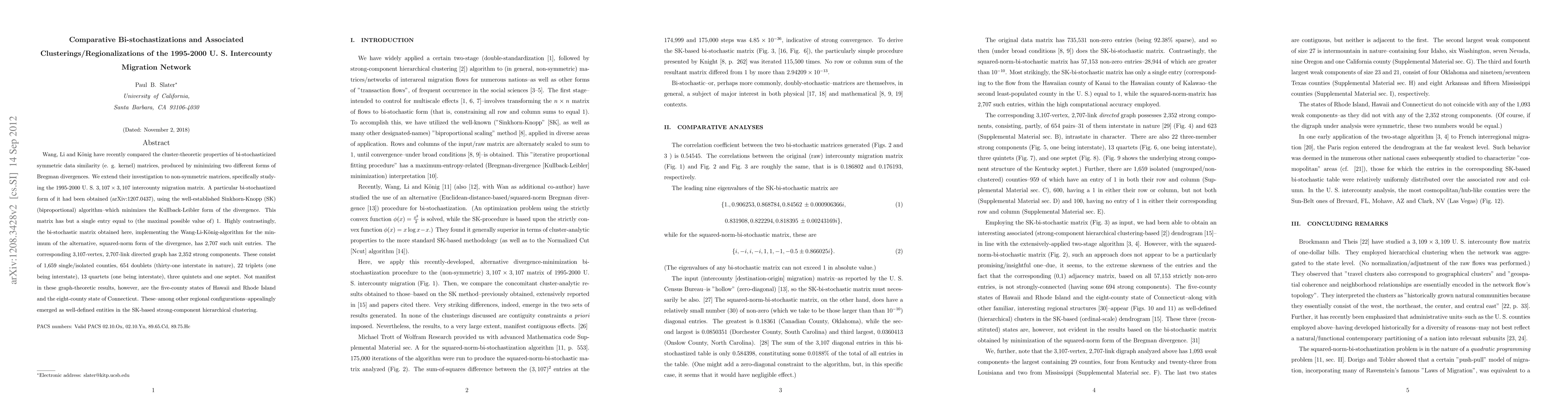 Wang, Li and Konig have recently compared the cluster-theoretic properties of bi-stochasticized symmetric data similarity (e. g. kernel) matrices, produced by minimizing two different forms of Bregman divergences. We extend their investigation to non-symmetric matrices, specifically studying the 1995-2000 U. S. 3,107 x 3,107 intercounty migration matrix. A particular bi-stochastized form of it had been obtained (arXiv:1207.0437), using the well-established Sinkhorn-Knopp (SK) (biproportional) algorithm--which minimizes the Kullback-Leibler form of the divergence. This matrix has but a single entry equal to (the maximal possible value of) 1. Highly contrastingly, the bi-stochastic matrix obtained here, implementing the Wang-Li-Konig-algorithm for the minimum of the alternative, squared-norm form of the divergence, has 2,707 such unit entries. The corresponding 3,107-vertex, 2,707-link directed graph has 2,352 strong components. These consist of 1,659 single/isolated counties, 654 doublets (thirty-one interstate in nature), 22 triplets (one being interstate), 13 quartets (one being interstate), three quintets and one septet. Not manifest in these graph-theoretic results, however, are the five-county states of Hawaii and Rhode Island and the eight-county state of Connecticut. These--among other regional configurations--appealingly emerged as well-defined entities in the SK-based strong-component hierarchical clustering.