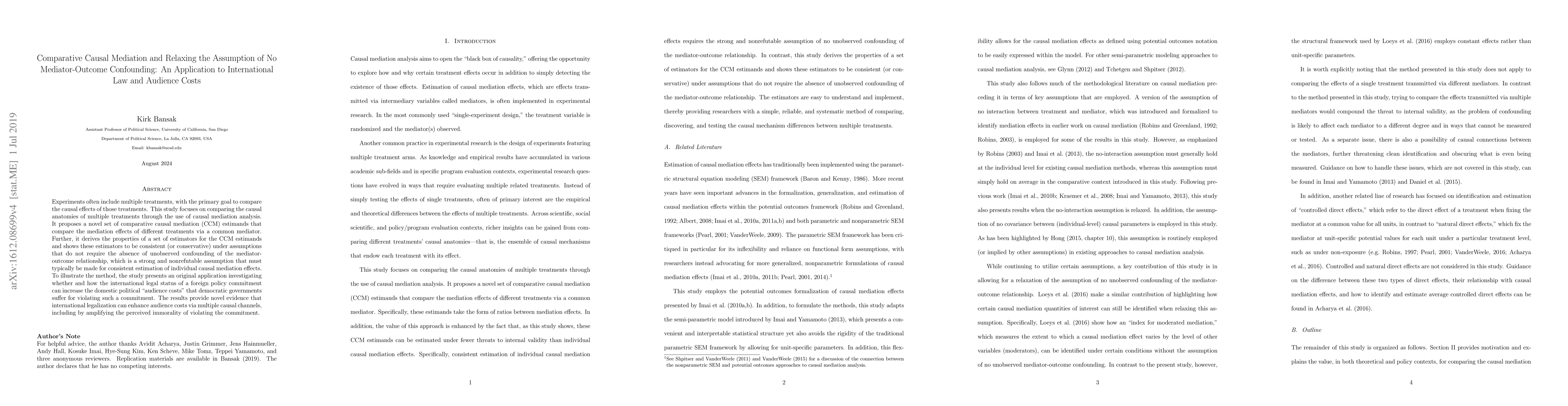 This paper introduces comparative causal mediation (CCM) estimands to compare the mediation effects of multiple treatments without requiring the absence of unobserved confounding. It demonstrates the method's application in assessing how international legal status influences domestic political "audience costs" for democratic governments, revealing multiple causal channels, including perceived immorality, through which legalization can enhance these costs.