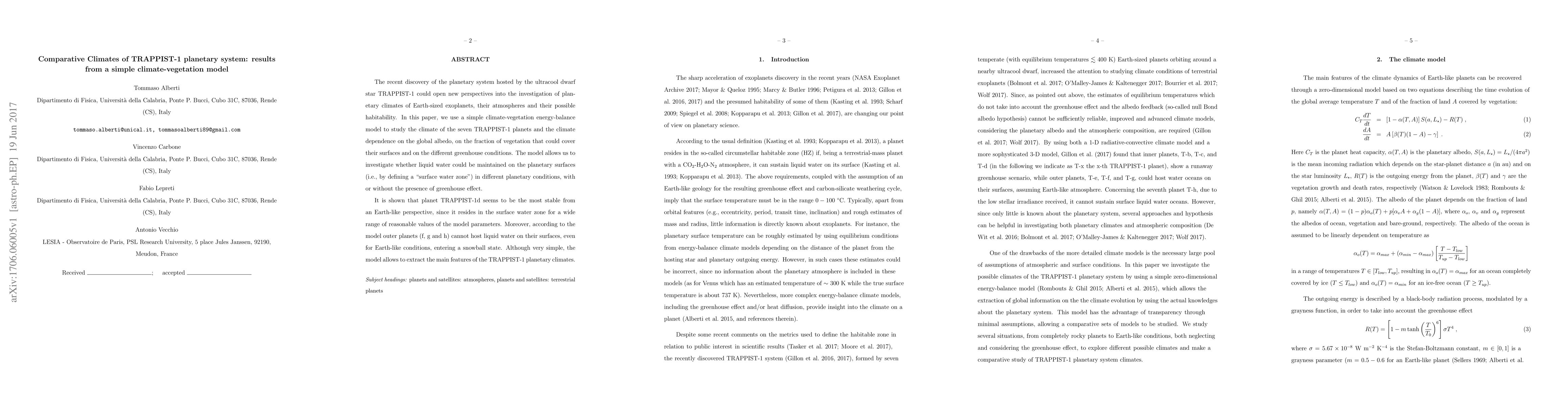 This paper employs a simple climate-vegetation model to analyze the climates of the seven TRAPPIST-1 planets, finding that TRAPPIST-1d is the most Earth-like and stable, while outer planets f, g, and h are unlikely to support liquid water, potentially entering a snowball state.