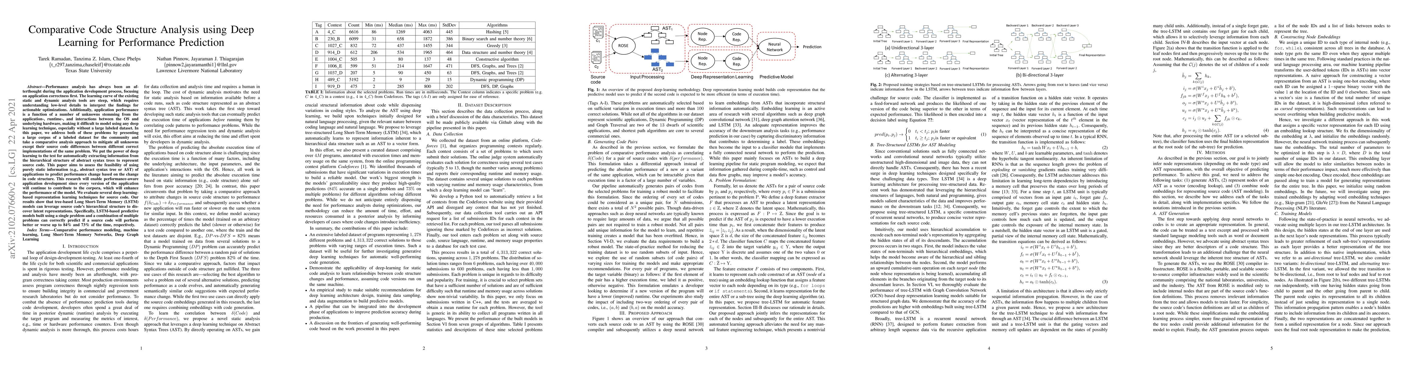 Performance analysis has always been an afterthought during the application development process, focusing on application correctness first. The learning curve of the existing static and dynamic analysis tools are steep, which requires understanding low-level details to interpret the findings for actionable optimizations. Additionally, application performance is a function of an infinite number of unknowns stemming from the application-, runtime-, and interactions between the OS and underlying hardware, making it difficult, if not impossible, to model using any deep learning technique, especially without a large labeled dataset. In this paper, we address both of these problems by presenting a large corpus of a labeled dataset for the community and take a comparative analysis approach to mitigate all unknowns except their source code differences between different correct implementations of the same problem. We put the power of deep learning to the test for automatically extracting information from the hierarchical structure of abstract syntax trees to represent source code. This paper aims to assess the feasibility of using purely static information (e.g., abstract syntax tree or AST) of applications to predict performance change based on the change in code structure. This research will enable performance-aware application development since every version of the application will continue to contribute to the corpora, which will enhance the performance of the model. Our evaluations of several deep embedding learning methods demonstrate that tree-based Long Short-Term Memory (LSTM) models can leverage the hierarchical structure of source-code to discover latent representations and achieve up to 84% (individual problem) and 73% (combined dataset with multiple of problems) accuracy in predicting the change in performance.