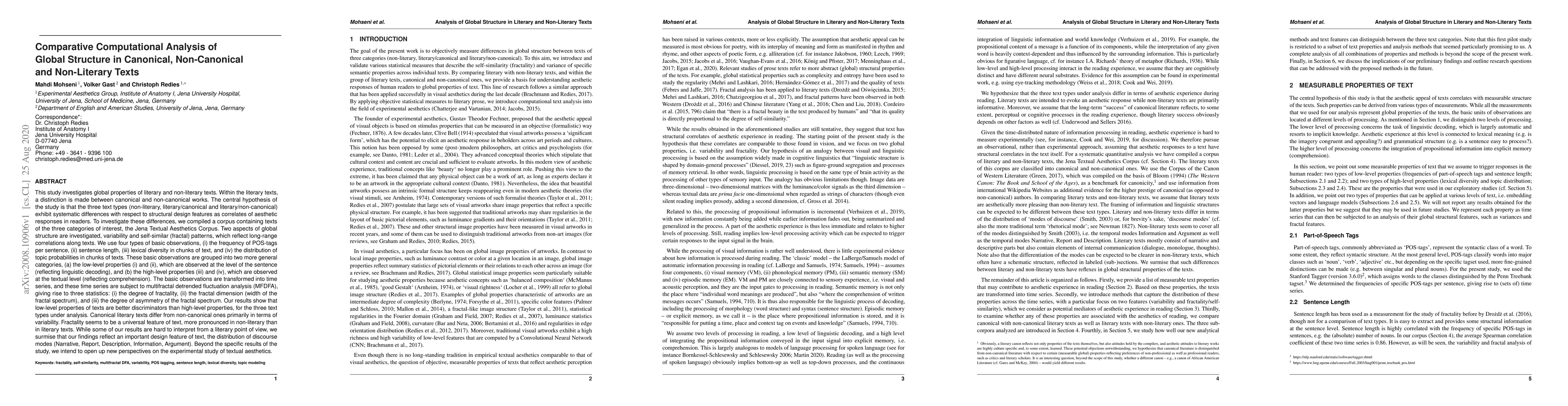 This study investigates global properties of literary and non-literary texts. Within the literary texts, a distinction is made between canonical and non-canonical works. The central hypothesis of the study is that the three text types (non-literary, literary/canonical and literary/non-canonical) exhibit systematic differences with respect to structural design features as correlates of aesthetic responses in readers. To investigate these differences, we compiled a corpus containing texts of the three categories of interest, the Jena Textual Aesthetics Corpus. Two aspects of global structure are investigated, variability and self-similar (fractal) patterns, which reflect long-range correlations along texts. We use four types of basic observations, (i) the frequency of POS-tags per sentence, (ii) sentence length, (iii) lexical diversity in chunks of text, and (iv) the distribution of topic probabilities in chunks of texts. These basic observations are grouped into two more general categories, (a) the low-level properties (i) and (ii), which are observed at the level of the sentence (reflecting linguistic decoding), and (b) the high-level properties (iii) and (iv), which are observed at the textual level (reflecting comprehension). The basic observations are transformed into time series, and these time series are subject to multifractal detrended fluctuation analysis (MFDFA). Our results show that low-level properties of texts are better discriminators than high-level properties, for the three text types under analysis. Canonical literary texts differ from non-canonical ones primarily in terms of variability. Fractality seems to be a universal feature of text, more pronounced in non-literary than in literary texts. Beyond the specific results of the study, we intend to open up new perspectives on the experimental study of textual aesthetics.