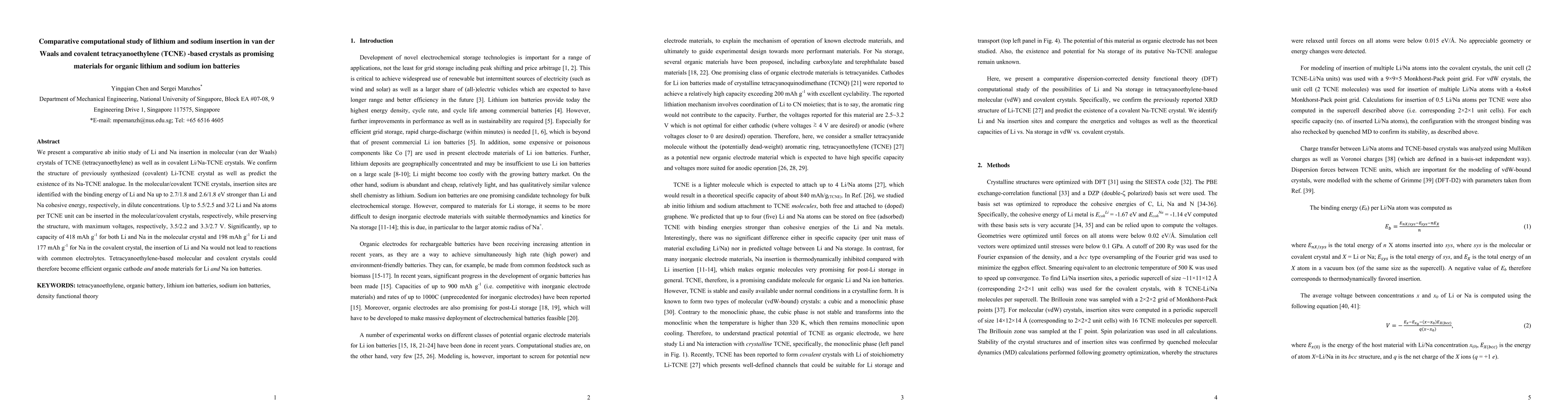The study uses ab initio computations to compare lithium and sodium insertion in tetracyanoethylene (TCNE) molecular and covalent crystals, confirming the structure of Li-TCNE and predicting Na-TCNE. Both Li and Na insertion maintains crystal structure with high binding energies and potential for high capacity, showing promise as efficient organic cathode and anode materials for Li and Na ion batteries without reacting with common electrolytes.
