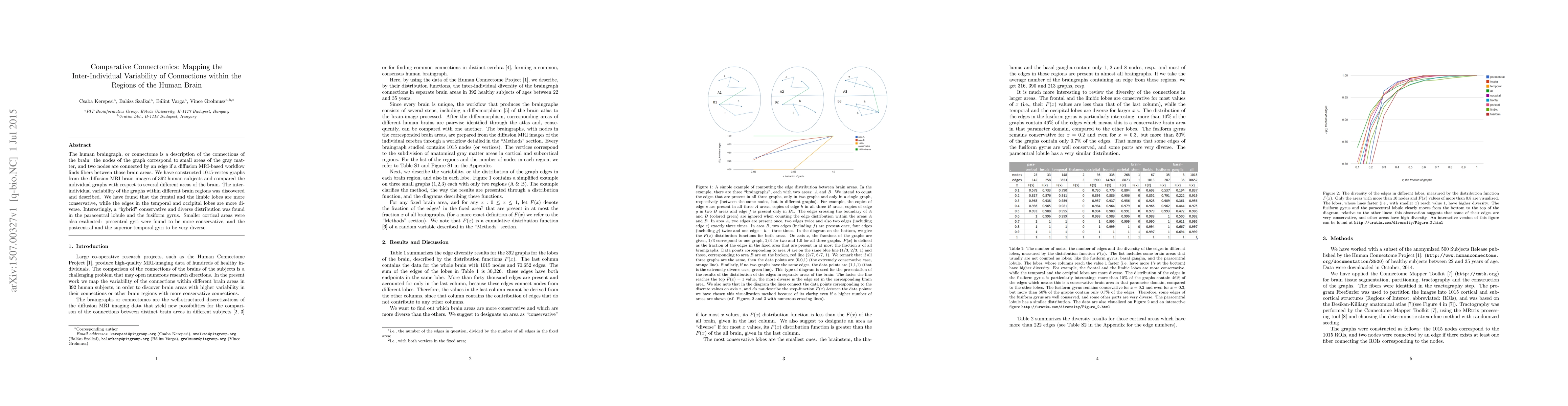 The human braingraph, or connectome is a description of the connections of the brain: the nodes of the graph correspond to small areas of the gray matter, and two nodes are connected by an edge if a diffusion MRI-based workflow finds fibers between those brain areas. We have constructed 1015-vertex graphs from the diffusion MRI brain images of 395 human subjects and compared the individual graphs with respect to several different areas of the brain. The inter-individual variability of the graphs within different brain regions was discovered and described. We have found that the frontal and the limbic lobes are more conservative, while the edges in the temporal and occipital lobes are more diverse. Interestingly, a "hybrid" conservative and diverse distribution was found in the paracentral lobule and the fusiform gyrus. Smaller cortical areas were also evaluated: precentral gyri were found to be more conservative, and the postcentral and the superior temporal gyri to be very diverse.