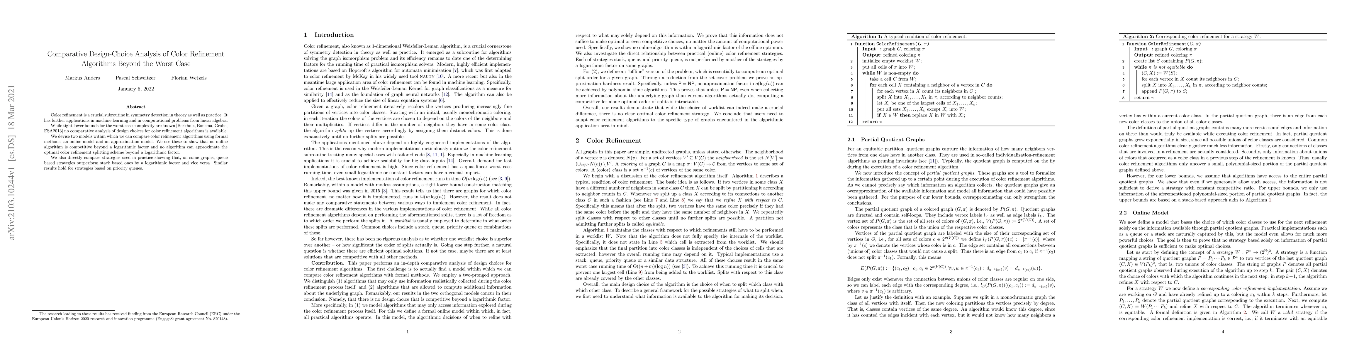 This paper introduces two models to compare color refinement algorithms, revealing that no online algorithm is competitive beyond a logarithmic factor and no algorithm can approximate the optimal splitting scheme beyond a logarithmic factor. It also shows practical strategies' performance differences, finding that queue-based strategies outperform stack-based ones on some graphs by a logarithmic factor.