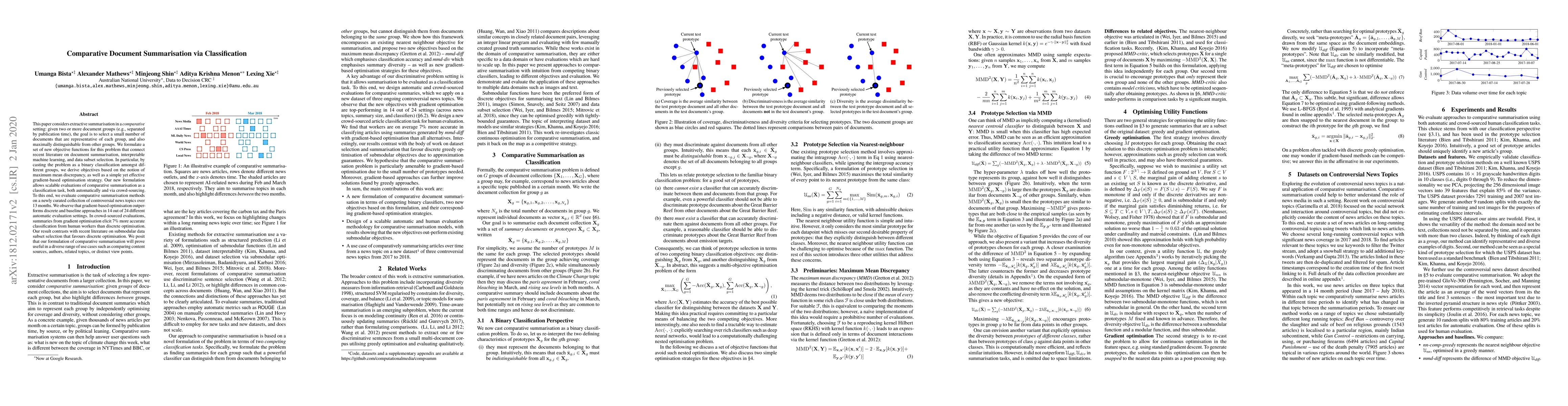 This paper considers extractive summarisation in a comparative setting: given two or more document groups (e.g., separated by publication time), the goal is to select a small number of documents that are representative of each group, and also maximally distinguishable from other groups. We formulate a set of new objective functions for this problem that connect recent literature on document summarisation, interpretable machine learning, and data subset selection. In particular, by casting the problem as a binary classification amongst different groups, we derive objectives based on the notion of maximum mean discrepancy, as well as a simple yet effective gradient-based optimisation strategy. Our new formulation allows scalable evaluations of comparative summarisation as a classification task, both automatically and via crowd-sourcing. To this end, we evaluate comparative summarisation methods on a newly curated collection of controversial news topics over 13 months. We observe that gradient-based optimisation outperforms discrete and baseline approaches in 14 out of 24 different automatic evaluation settings. In crowd-sourced evaluations, summaries from gradient optimisation elicit 7% more accurate classification from human workers than discrete optimisation. Our result contrasts with recent literature on submodular data subset selection that favours discrete optimisation. We posit that our formulation of comparative summarisation will prove useful in a diverse range of use cases such as comparing content sources, authors, related topics, or distinct view points.