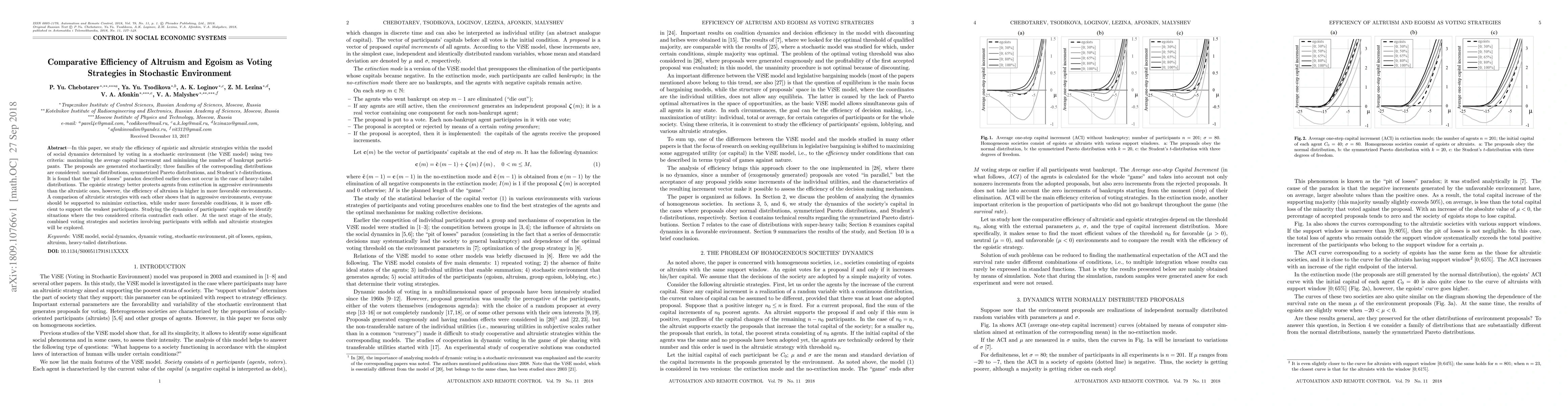 In this paper, we study the efficiency of egoistic and altruistic strategies within the model of social dynamics determined by voting in a stochastic environment (the ViSE model) using two criteria: maximizing the average capital increment and minimizing the number of bankrupt participants. The proposals are generated stochastically; three families of the corresponding distributions are considered: normal distributions, symmetrized Pareto distributions, and Student's $t$-distributions. It is found that the "pit of losses" paradox described earlier does not occur in the case of heavy-tailed distributions. The egoistic strategy better protects agents from extinction in aggressive environments than the altruistic ones, however, the efficiency of altruism is higher in more favorable environments. A comparison of altruistic strategies with each other shows that in aggressive environments, everyone should be supported to minimize extinction, while under more favorable conditions, it is more efficient to support the weakest participants. Studying the dynamics of participants' capitals we identify situations where the two considered criteria contradict each other. At the next stage of the study, combined voting strategies and societies involving participants with selfish and altruistic strategies will be explored.