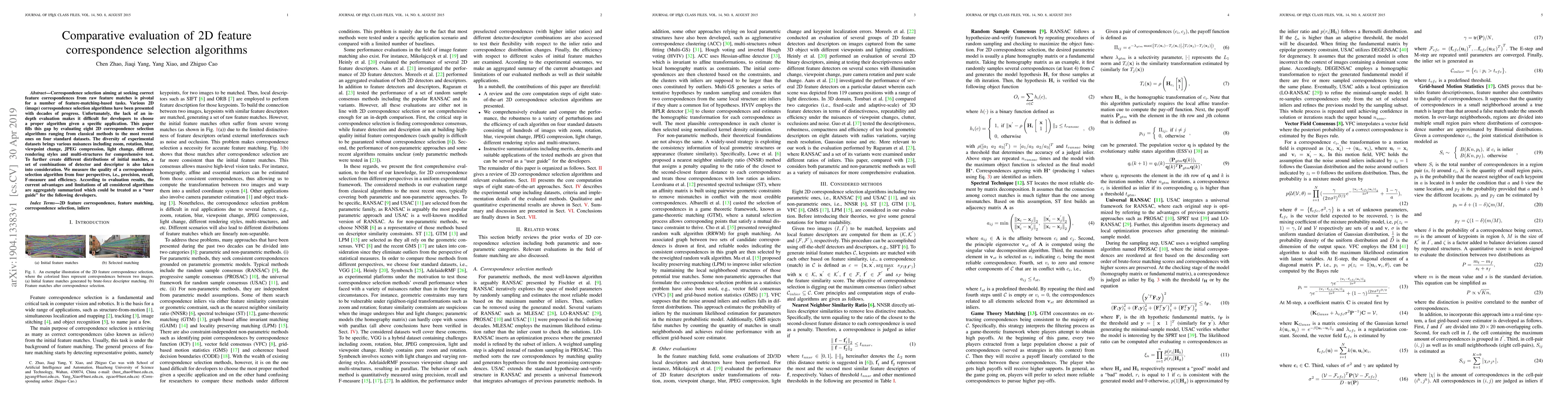 A comparative study evaluates eight 2D feature correspondence selection algorithms on four datasets, assessing precision, recall, F-measure, and efficiency to provide a comprehensive user guide for developers.