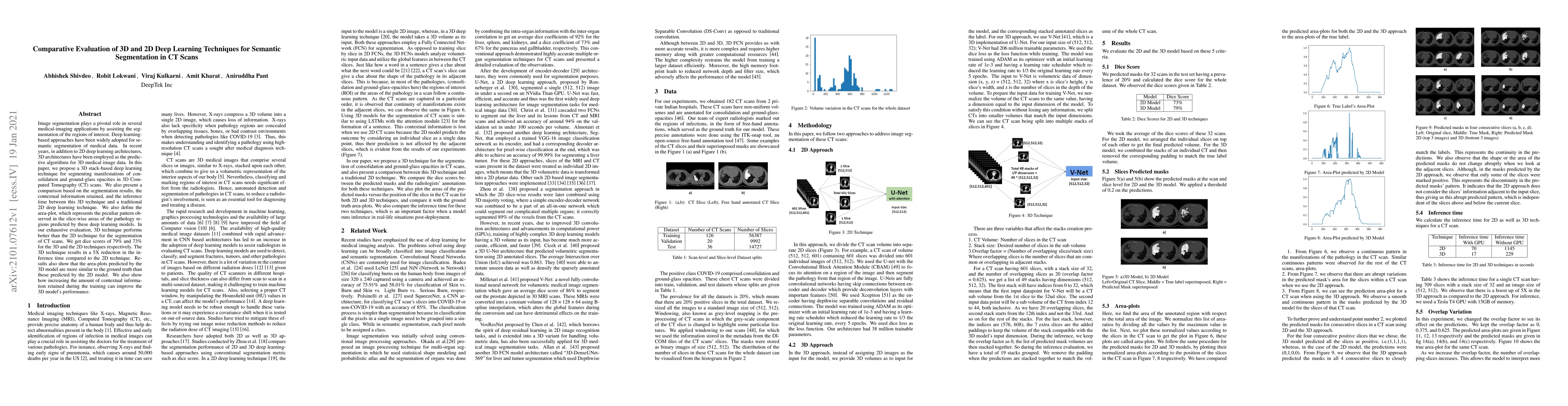 This paper compares 3D and 2D deep learning techniques for semantic segmentation in CT scans, finding that the 3D technique achieves higher dice scores (79% vs. 73%) and a 5X reduction in inference time, while also better retaining contextual information and producing area-plots more similar to ground truth.