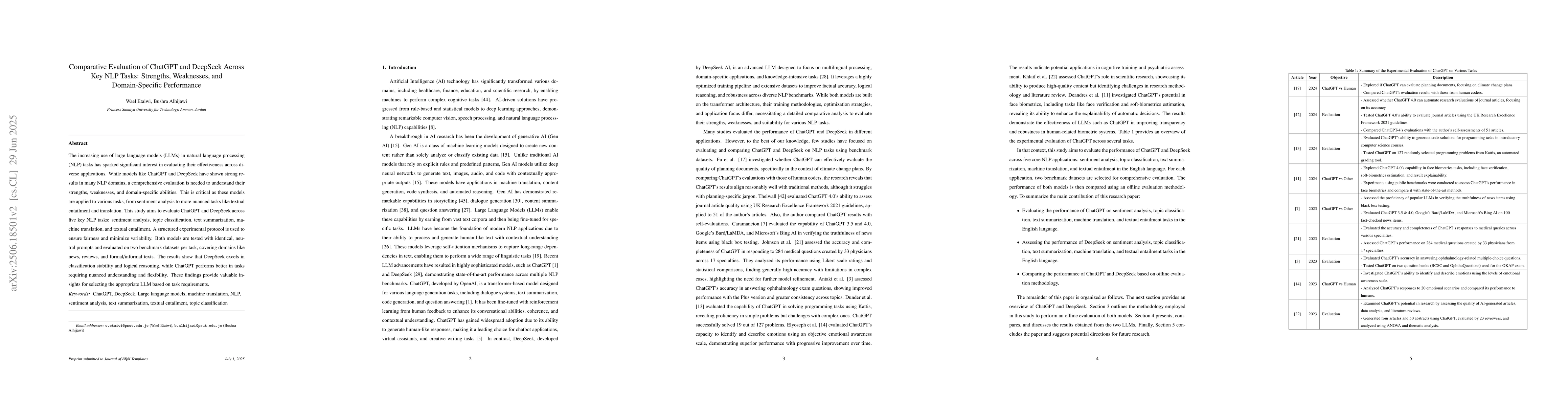 The increasing use of large language models (LLMs) in natural language processing (NLP) tasks has sparked significant interest in evaluating their effectiveness across diverse applications. While models like ChatGPT and DeepSeek have shown strong results in many NLP domains, a comprehensive evaluation is needed to understand their strengths, weaknesses, and domain-specific abilities. This is critical as these models are applied to various tasks, from sentiment analysis to more nuanced tasks like textual entailment and translation. This study aims to evaluate ChatGPT and DeepSeek across five key NLP tasks: sentiment analysis, topic classification, text summarization, machine translation, and textual entailment. A structured experimental protocol is used to ensure fairness and minimize variability. Both models are tested with identical, neutral prompts and evaluated on two benchmark datasets per task, covering domains like news, reviews, and formal/informal texts. The results show that DeepSeek excels in classification stability and logical reasoning, while ChatGPT performs better in tasks requiring nuanced understanding and flexibility. These findings provide valuable insights for selecting the appropriate LLM based on task requirements.