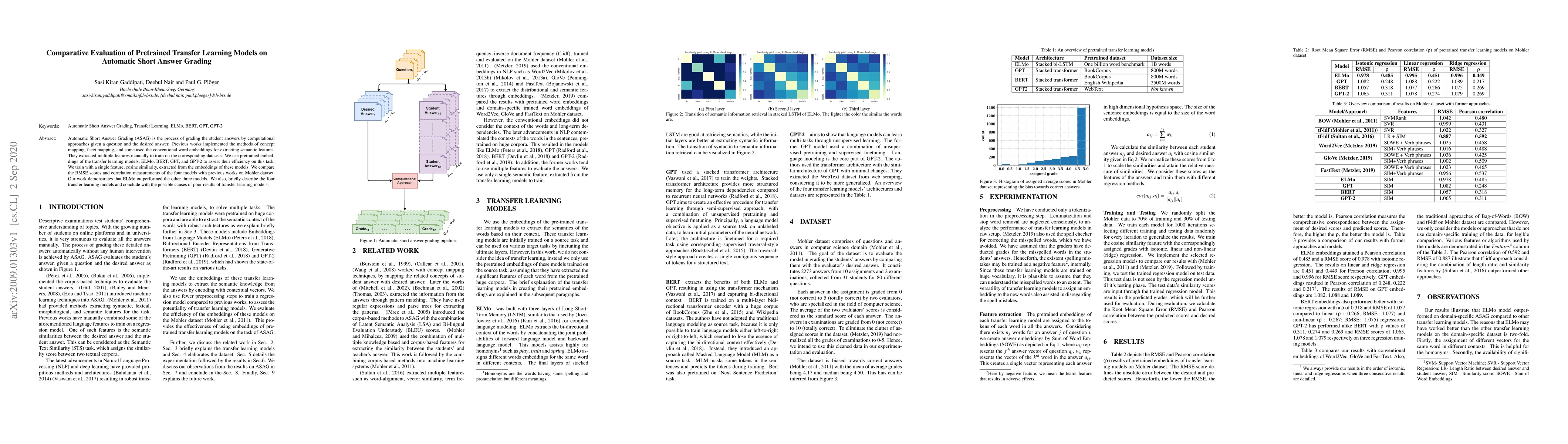 This paper evaluates the performance of pretrained transfer learning models—ELMo, BERT, GPT, and GPT-2—for automatic short answer grading (ASAG) using cosine similarity as the sole feature. ELMo is shown to outperform the other models based on RMSE scores and correlation measurements, while the study also discusses potential reasons for the underperformance of the other models.