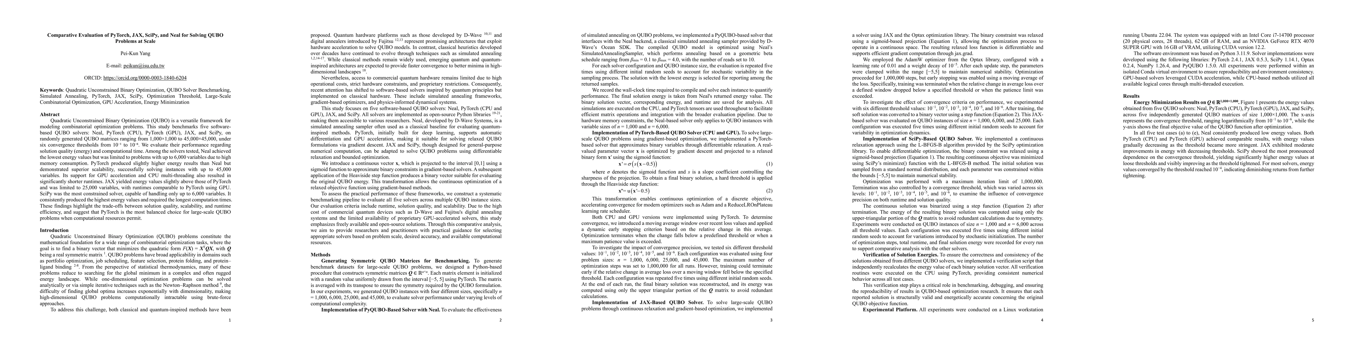 Quadratic Unconstrained Binary Optimization (QUBO) is a versatile framework for modeling combinatorial optimization problems. This study benchmarks five software-based QUBO solvers: Neal, PyTorch (CPU), PyTorch (GPU), JAX, and SciPy, on randomly generated QUBO matrices ranging from 1000x1000 to 45000x45000, under six convergence thresholds from 10^-1 to 10^-6. We evaluate their performance in terms of solution quality (energy) and computational time. Among the solvers tested, Neal achieved the lowest energy values but was limited to problems with up to 6000 variables due to high memory consumption. PyTorch produced slightly higher energy results than Neal but demonstrated superior scalability, solving instances with up to 45000 variables. Its support for GPU acceleration and CPU multi-threading also resulted in significantly shorter runtimes. JAX yielded energy values slightly above those of PyTorch and was limited to 25000 variables, with runtimes comparable to PyTorch on GPU. SciPy was the most constrained solver, handling only up to 6000 variables and consistently producing the highest energy values with the longest computation times. These findings highlight trade-offs between solution quality, scalability, and runtime efficiency, and suggest that PyTorch is the most balanced choice for large-scale QUBO problems when computational resources permit.