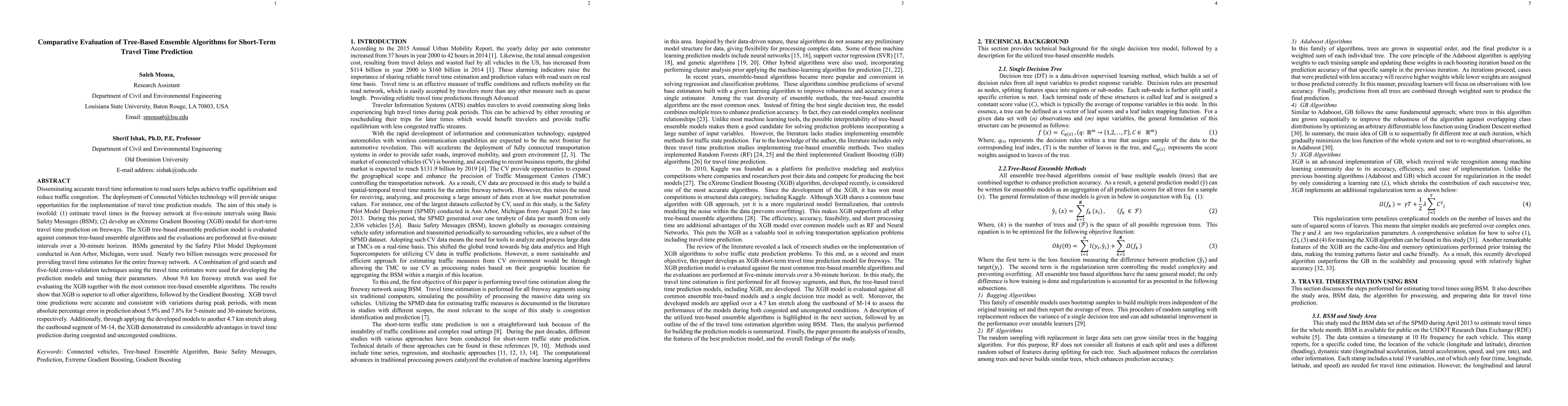 This study evaluates tree-based ensemble algorithms for short-term travel time prediction on freeways using Basic Safety Messages (BSM) data. The eXtreme Gradient Boosting (XGB) model outperformed other algorithms, achieving a mean absolute percentage error of 5.9% for 5-minute and 7.8% for 30-minute horizons, demonstrating its effectiveness in both peak and off-peak traffic conditions.