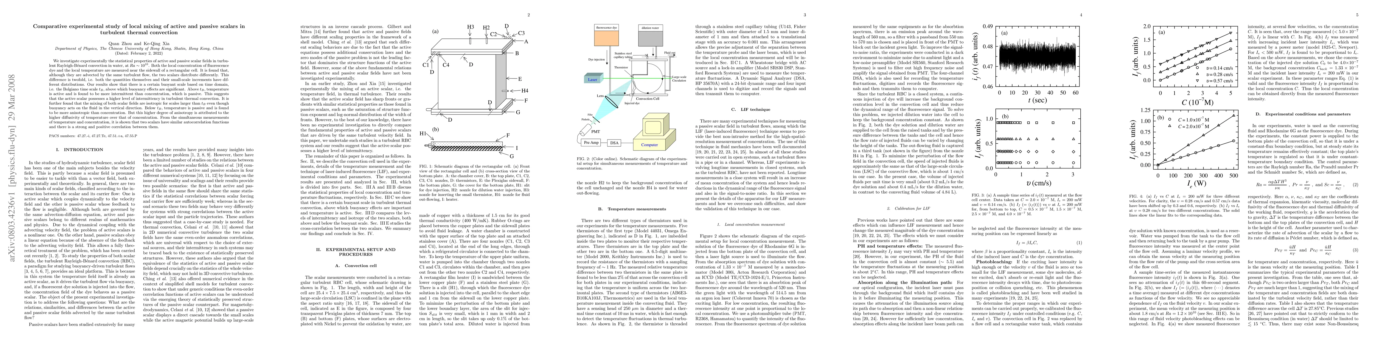 This study experimentally compares the mixing of active (temperature) and passive (fluorescence dye) scalars in turbulent Rayleigh-Bénard convection. Results show that while both scalars are influenced by the same turbulent flow, they exhibit different distributions and intermittency levels, with temperature being more intermittent above the Bolgiano time scale.