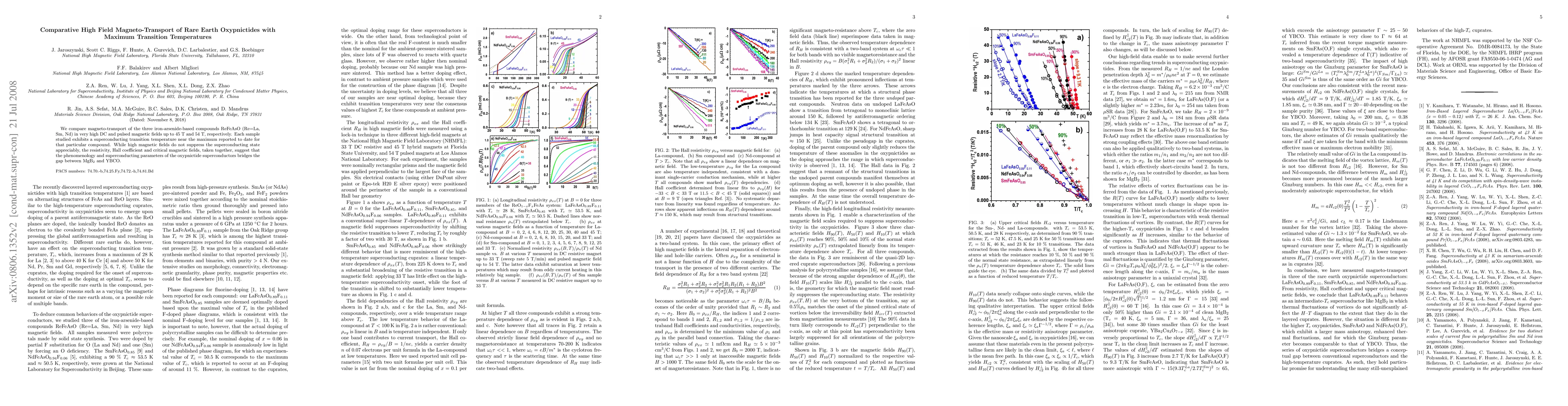 This study investigates the magneto-transport properties of rare earth oxypnictides (La, Nd, Sm) with high transition temperatures under extreme magnetic fields. The findings suggest these superconductors exhibit characteristics intermediate between MgB$_2$ and YBaCu$_3$O$_{7-x}$, indicating potential for advancing the understanding of unconventional high-temperature superconductivity.