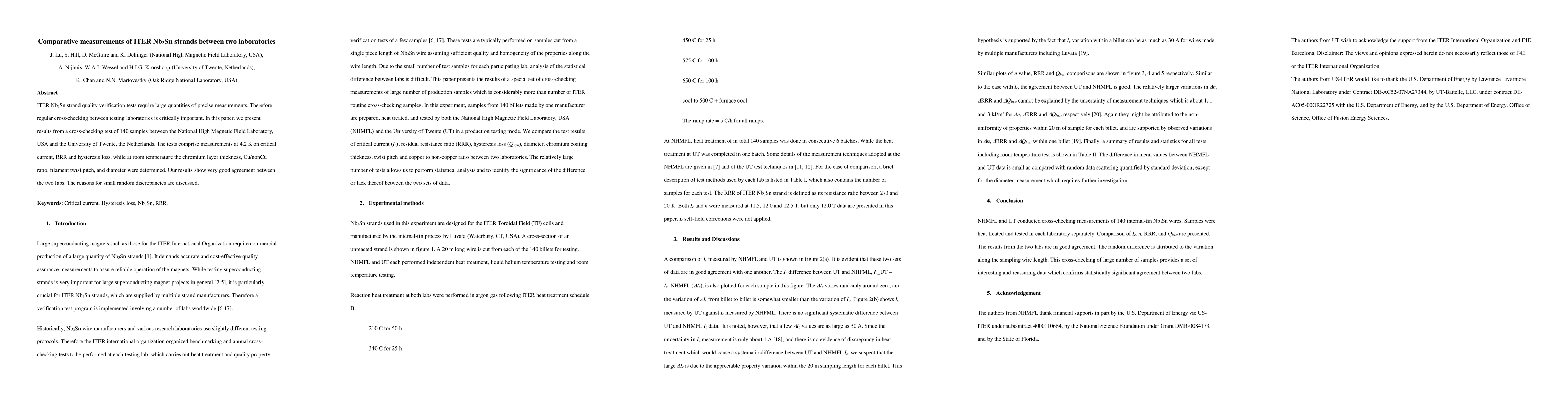 ITER Nb3Sn strand quality verification tests require large quantities of precise measurements. Therefore regular cross-checking between testing laboratories is critically important. In this paper, we present results from a cross-checking test of 140 samples between the National High Magnetic Field Laboratory, USA and the University of Twente, the Netherlands. The tests comprise measurements at 4.2 K on critical current, RRR and hysteresis loss, while at room temperature the chromium layer thickness, Cu/nonCu ratio, filament twist pitch, and diameter were determined. Our results show very good agreement between the two labs. The reasons for small random discrepancies are discussed.