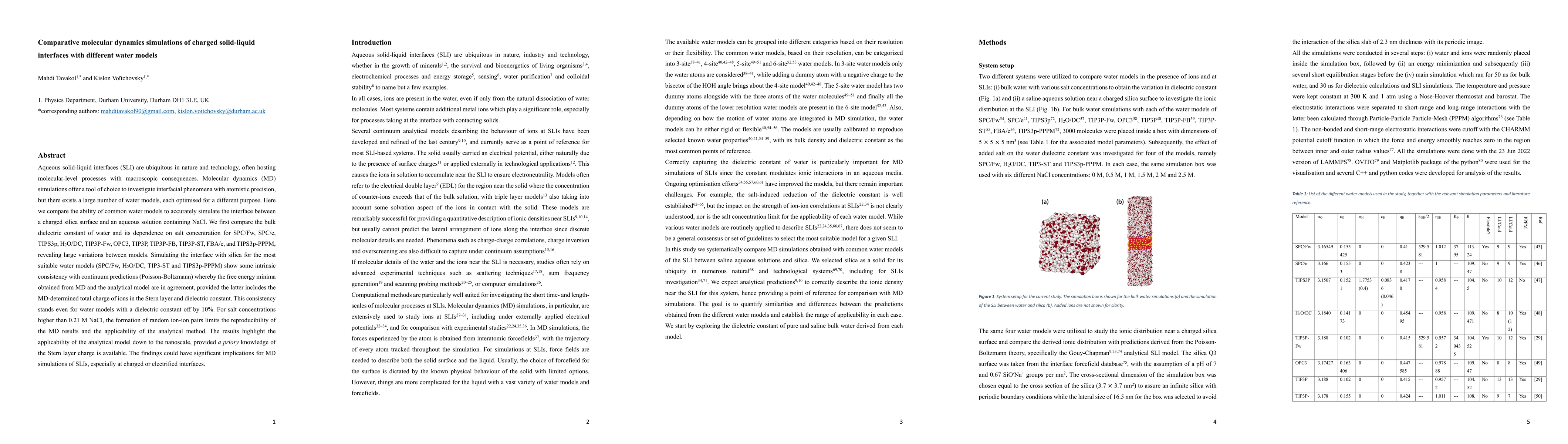 Aqueous solid-liquid interfaces (SLI) are ubiquitous in nature and technology, often hosting molecular-level processes with macroscopic consequences. Molecular dynamics (MD) simulations offer a tool of choice to investigate interfacial phenomena with atomistic precision, but there exists a large number of water models, each optimised for a different purpose. Here we compare the ability of common water models to accurately simulate the interface between a charged silica surface and an aqueous solution containing NaCl. We first compare the bulk dielectric constant of water and its dependence on salt concentration for SPC/Fw, SPC/e, TIPS3p, H2O/DC, TIP3P-Fw, OPC3, TIP3P, TIP3P-FB, TIP3P-ST, FBA/e, and TIPS3p-PPPM, revealing large variations between models. Simulating the interface with silica for the most suitable water models (SPC/Fw, H2O/DC, TIP3-ST and TIPS3p-PPPM) show some intrinsic consistency with continuum predictions (Poisson-Boltzmann) whereby the free energy minima obtained from MD and the analytical model are in agreement, provided the latter includes the MD-determined total charge of ions in the Stern layer and dielectric constant. This consistency stands even for water models with a dielectric constant off by 10%. For salt concentrations higher than 0.21 M NaCl, the formation of random ion-ion pairs limits the reproducibility of the MD results and the applicability of the analytical method. The results highlight the applicability of the analytical model down to the nanoscale, provided a priory knowledge of the Stern layer charge is available. The findings could have significant implications for MD simulations of SLIs, especially at charged or electrified interfaces.