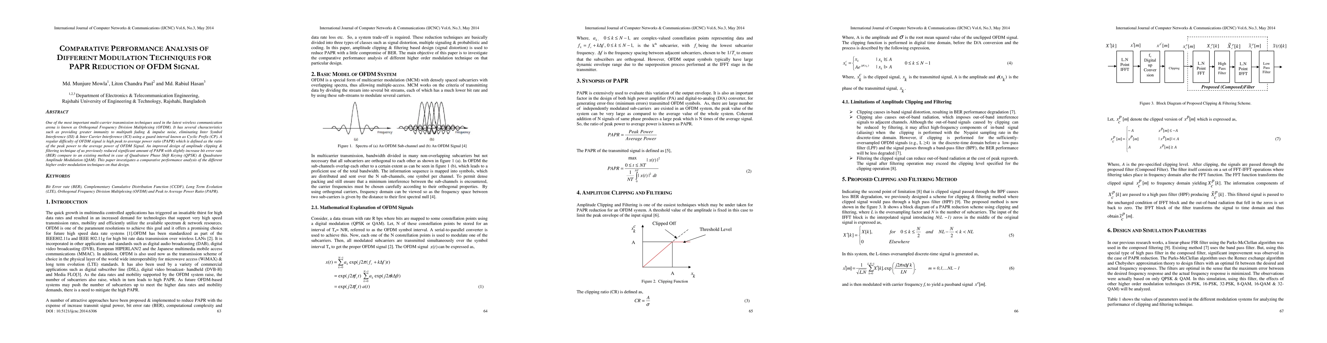 One of the most important multi-carrier transmission techniques used in the latest wireless communication arena is known as Orthogonal Frequency Division Multiplexing (OFDM). It has several characteristics such as providing greater immunity to multipath fading & impulse noise, eliminating Inter Symbol Interference (ISI) & Inter Carrier Interference (ICI) using a guard interval known as Cyclic Prefix (CP). A regular difficulty of OFDM signal is high peak to average power ratio (PAPR) which is defined as the ratio of the peak power to the average power of OFDM Signal. An improved design of amplitude clipping & filtering technique of us previously reduced significant amount of PAPR with slightly increase bit error rate (BER) compare to an existing method in case of Quadrature Phase Shift Keying (QPSK) & Quadrature Amplitude Modulation (QAM). This paper investigates a comparative performance analysis of the different higher order modulation techniques on that design.