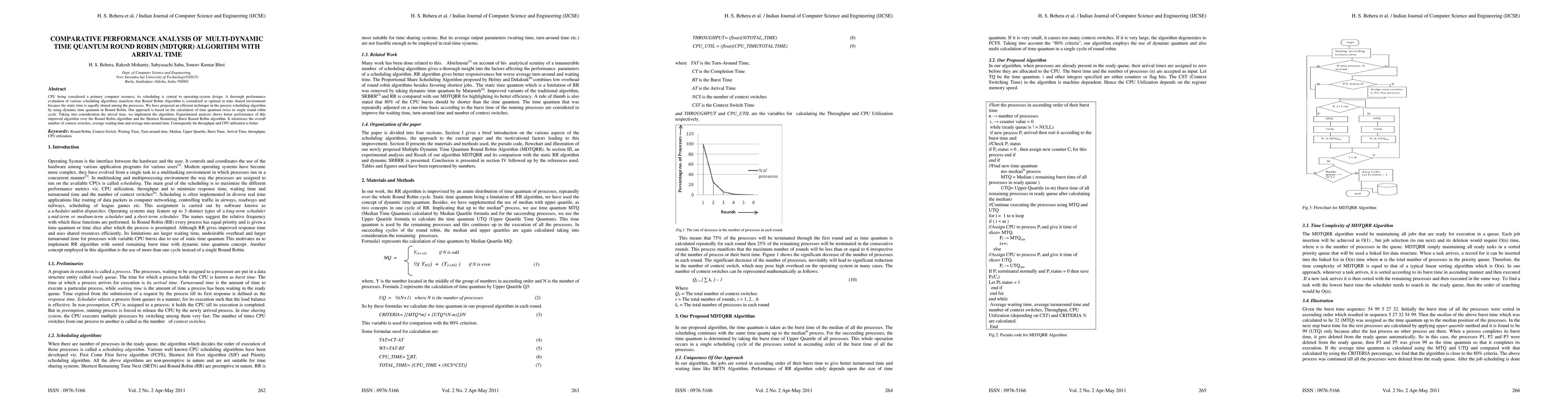 This paper proposes an MDTQRR scheduling algorithm that dynamically adjusts time quantum based on arrival time, showing improved performance over traditional Round Robin and Shortest Remaining Burst Round Robin algorithms by reducing context switches, waiting time, and turn-around time, thereby enhancing throughput and CPU utilization.