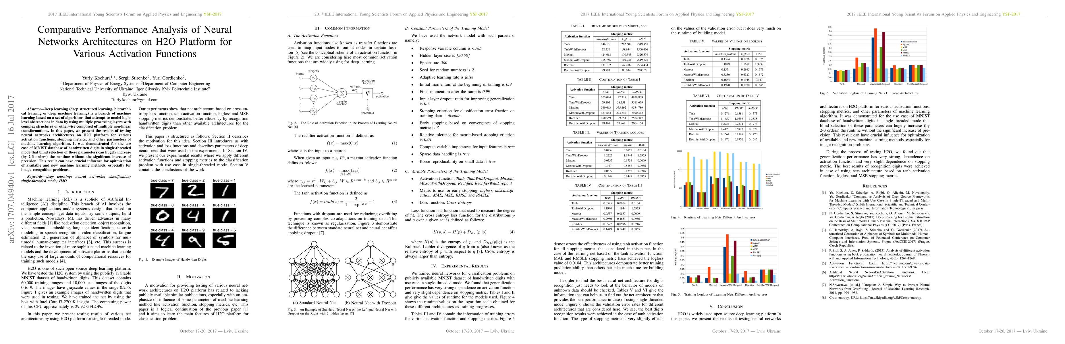 Deep learning (deep structured learning, hierarchi- cal learning or deep machine learning) is a branch of machine learning based on a set of algorithms that attempt to model high- level abstractions in data by using multiple processing layers with complex structures or otherwise composed of multiple non-linear transformations. In this paper, we present the results of testing neural networks architectures on H2O platform for various activation functions, stopping metrics, and other parameters of machine learning algorithm. It was demonstrated for the use case of MNIST database of handwritten digits in single-threaded mode that blind selection of these parameters can hugely increase (by 2-3 orders) the runtime without the significant increase of precision. This result can have crucial influence for opitmization of available and new machine learning methods, especially for image recognition problems.